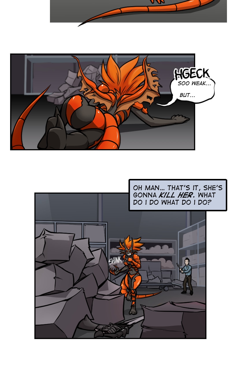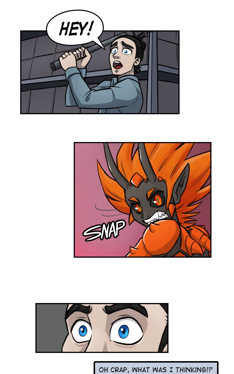 Our main character obviously has very limited fighting experience. The way he's holding the pipe over his shoulder is not a good way to hold it for effective strikes (better to swing from the hip), and yelling to get Demon Lady's attention is a terrible idea. Sneaking up on her probably isn't going to work - we don't know what sort of supernatural senses she has - but he still may have been able to surprise her a little bit. Yelling removes his advantage of being at her back.