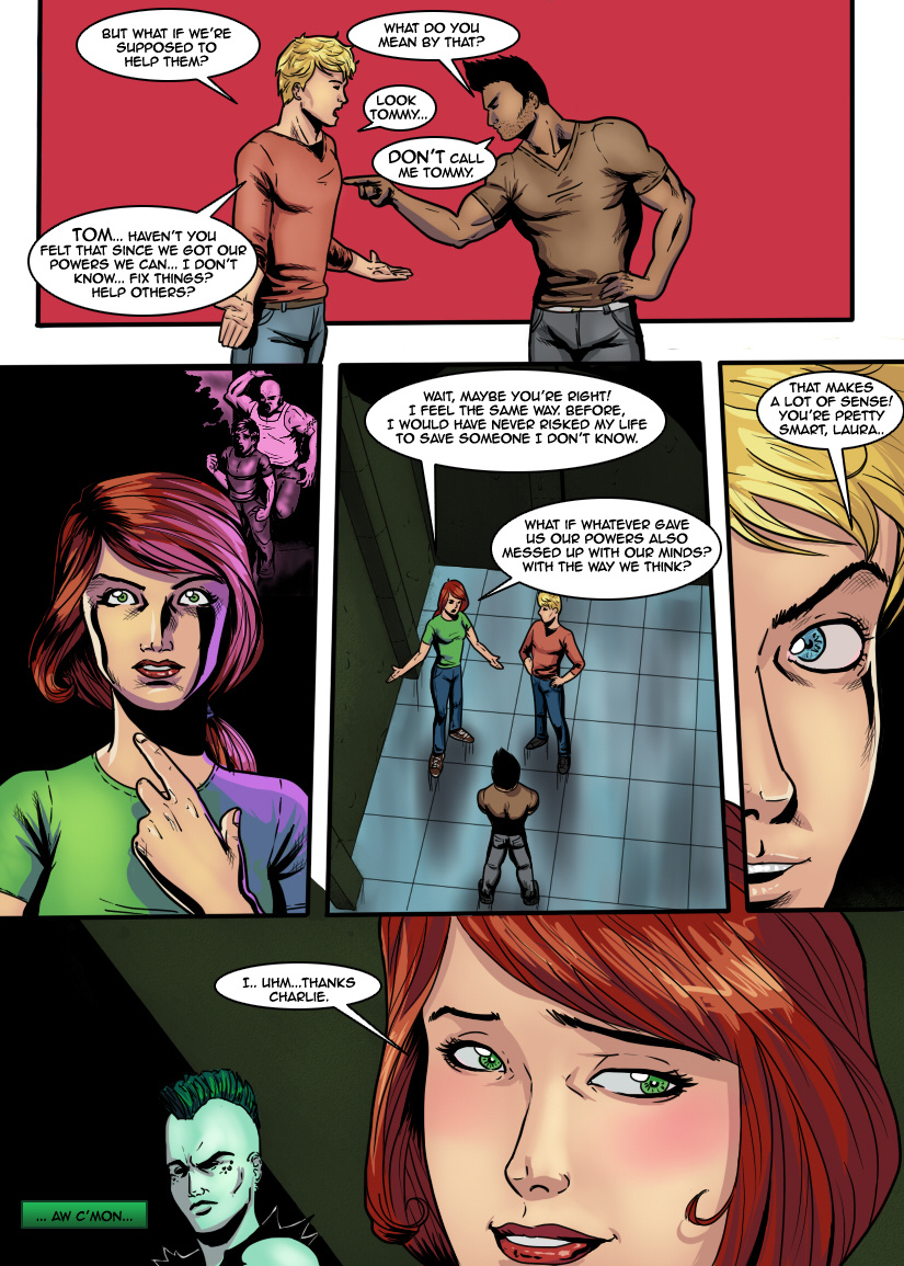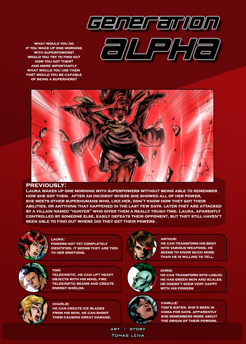 Generation Alpha is a superhero webcomic about a group of people who wake up one day with super abilities and no memories of the past few days. They'll have to group together and find out what's behind their new skills. But they'll have to be careful because they're not the only ones with new powers around, and not all of them are willing to use them for good.