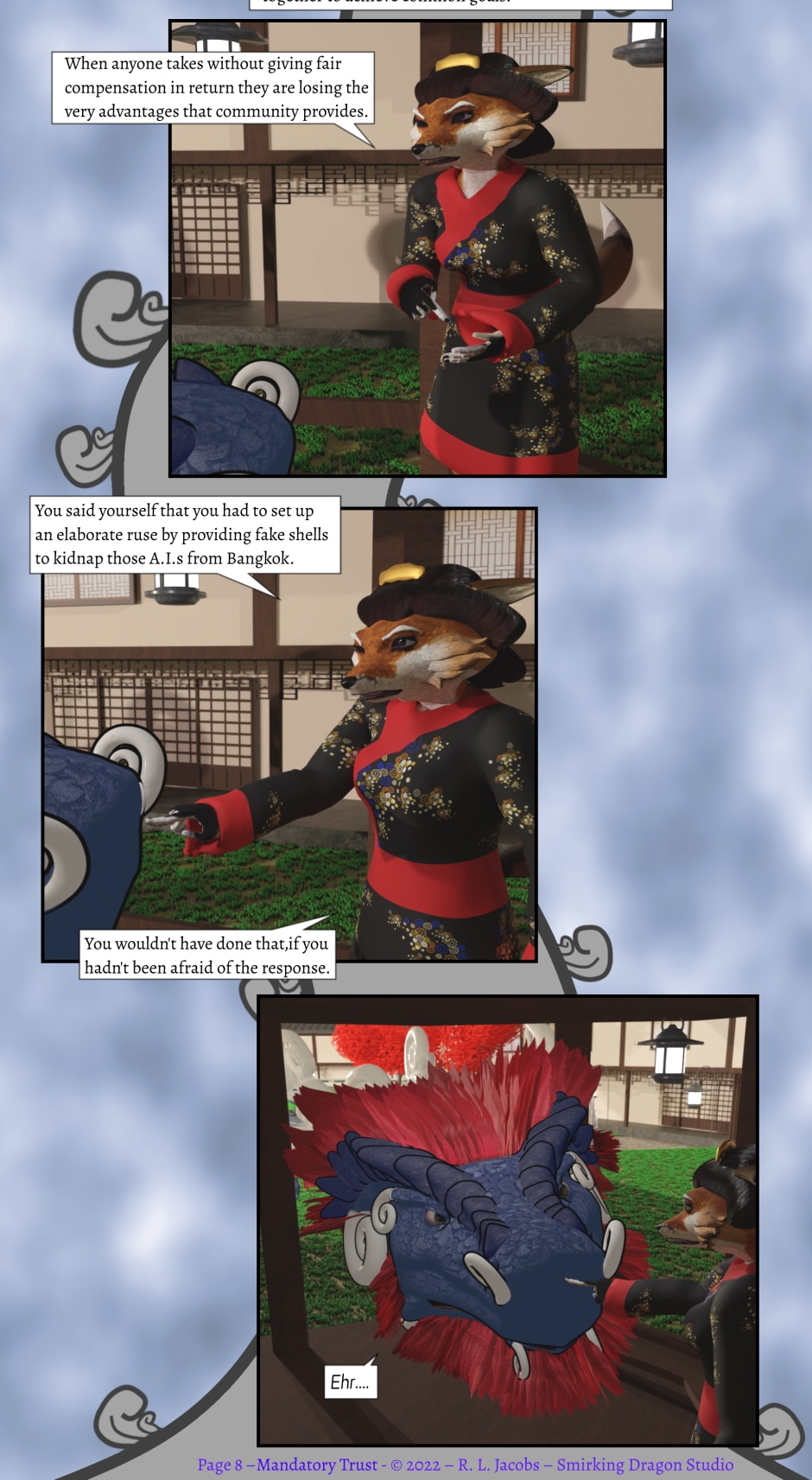 Humanity has spread throughout the solar system with the help of true Artificial Intelligence. Decades ago, the first true A.I. helped invent the reactionless drive called the Virtual Higgs Boson Generators. Since then, true A.I.s have become commonplace embodied in a spectacular variety of robotic shells. This variety is a consequence of the restriction that their shell must be visually distinct from that of a natural human, under which they are granted full legal status as persons.