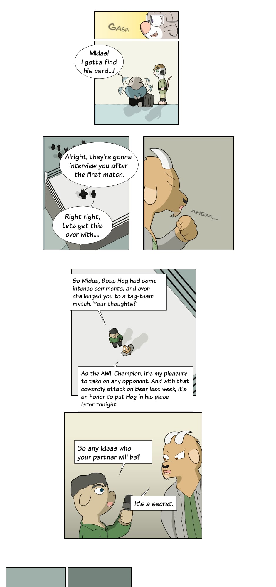 "Hey how's it goin'? They call me Boss Hog: the big, bad leader of the Vile Snouts. Along with Commando Dragon, Trash Can Badger, and Biz Cat; we're infamous for our antics across the entire Animal Wrestling League. Interfering in matches, attacking outside the ring, or just plain cheatin': the Vile Snouts win by any means...!