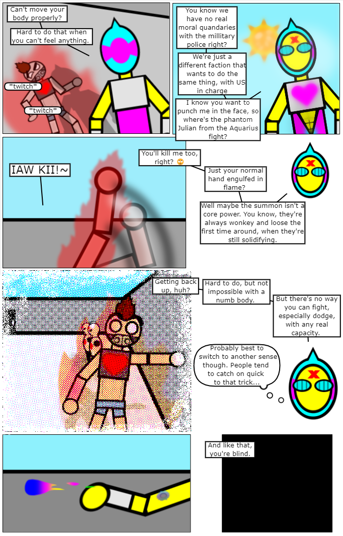 More enemies abound! Julian got lucky the first time, but can he handle the next elite military police member, Aquarius? New members join the cast, new relationships form, old relationships end!