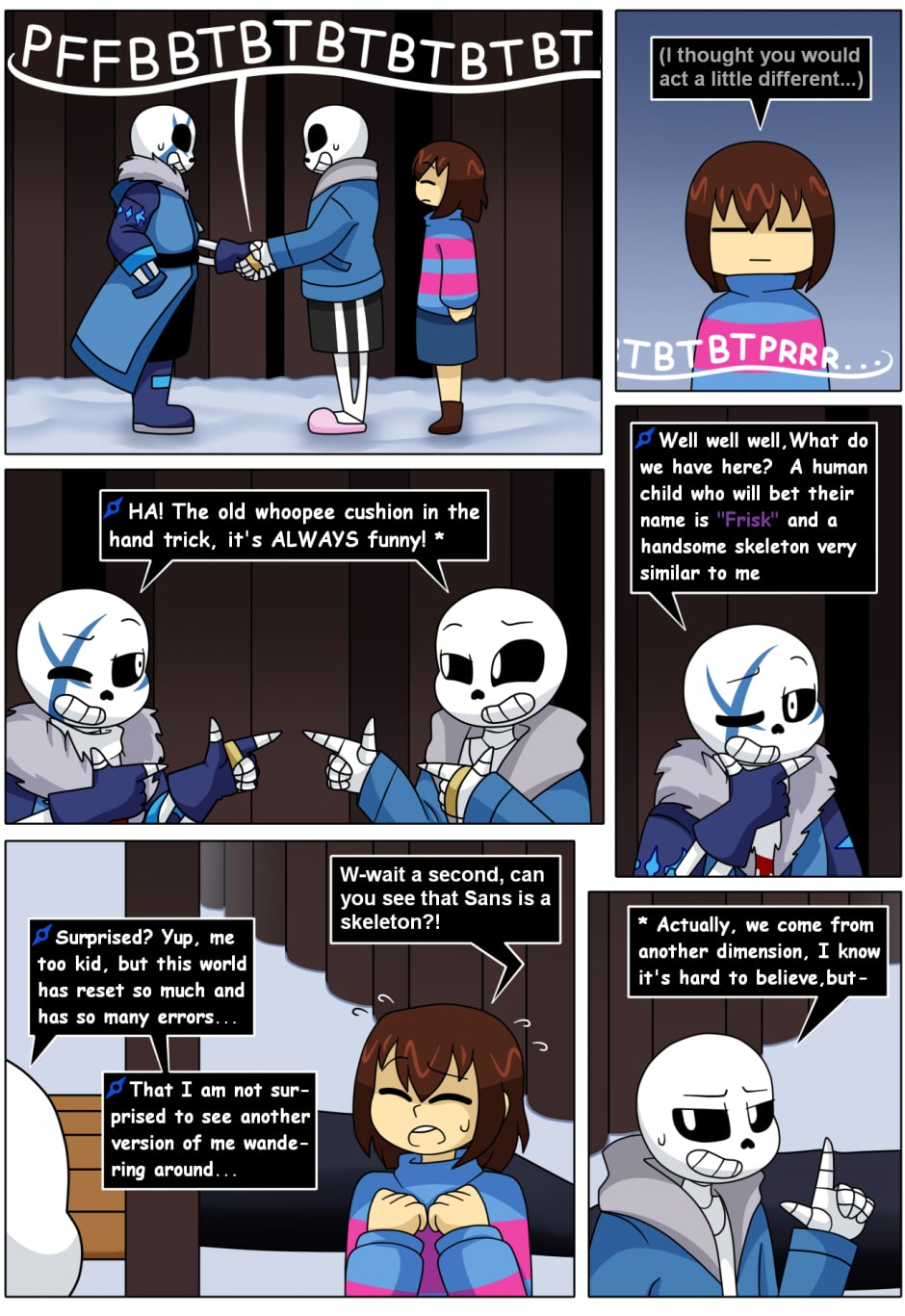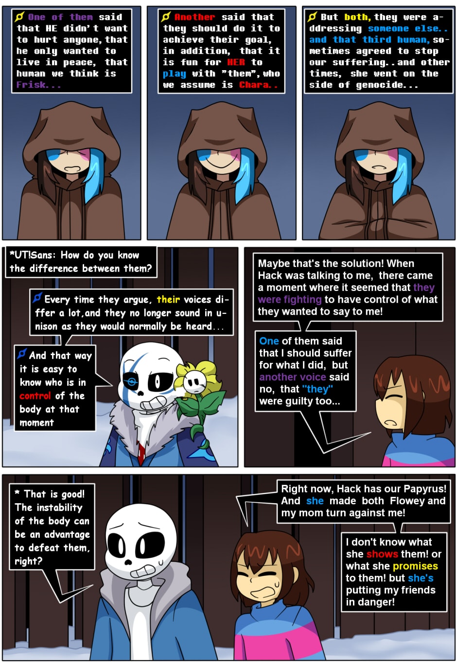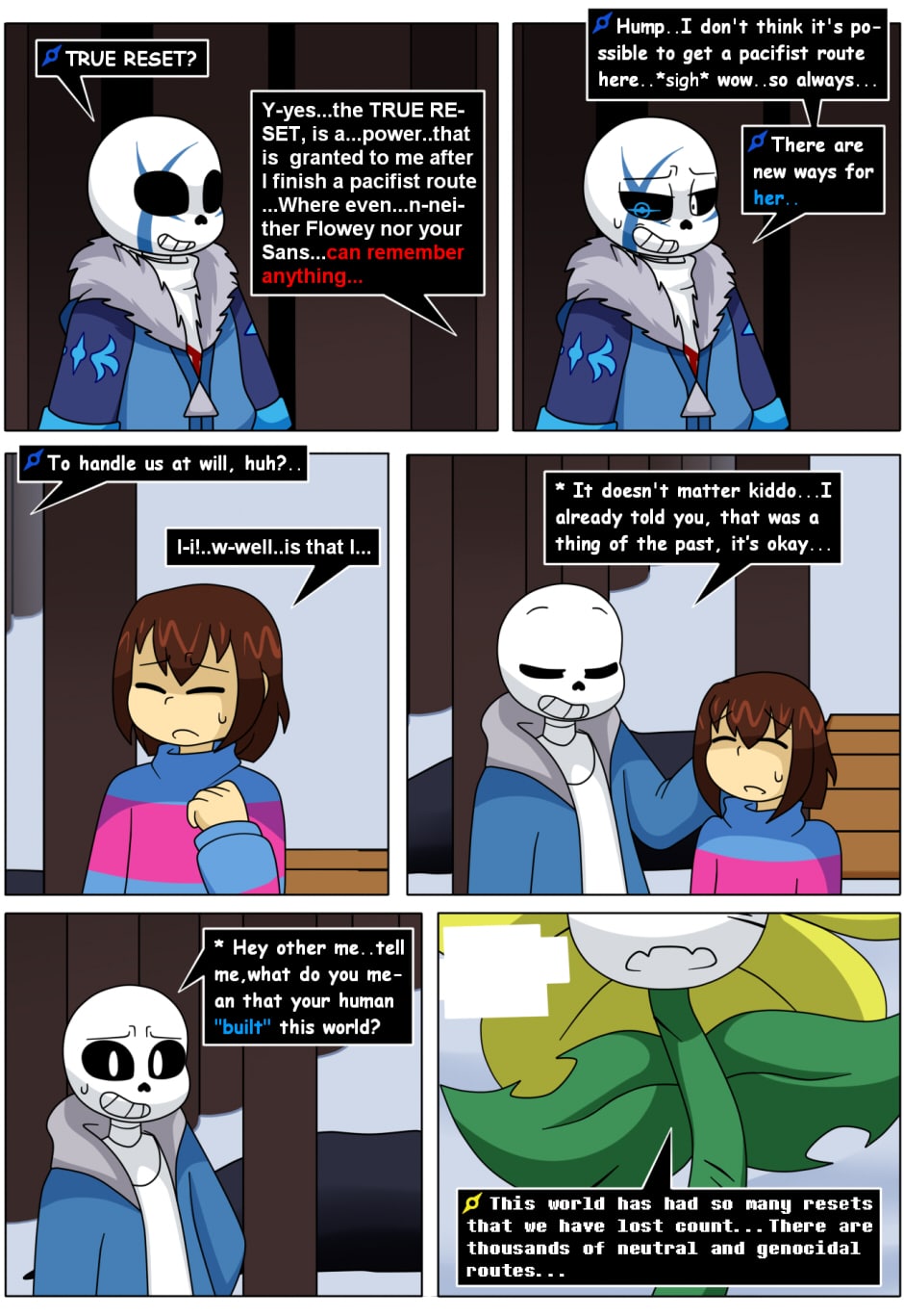 Six years after the liberation of the monsters from the underground, Frisk along with their friends live happily and peacefully on the surface, however, this happiness is interrupted when a new enemy appears. "The player", jealous of Frisk for the life they can lead with the inhabitants of the underground, decides to attack and remind the Frisk of their genocidal past, now Frisk with Sans must find "The Player" and end the suffering that she has caused, not only in UNDERTALE, but also in other universes. [The main objective of "The Player" will be to make Frisk suffer...Or is there something else she has forgotten?].