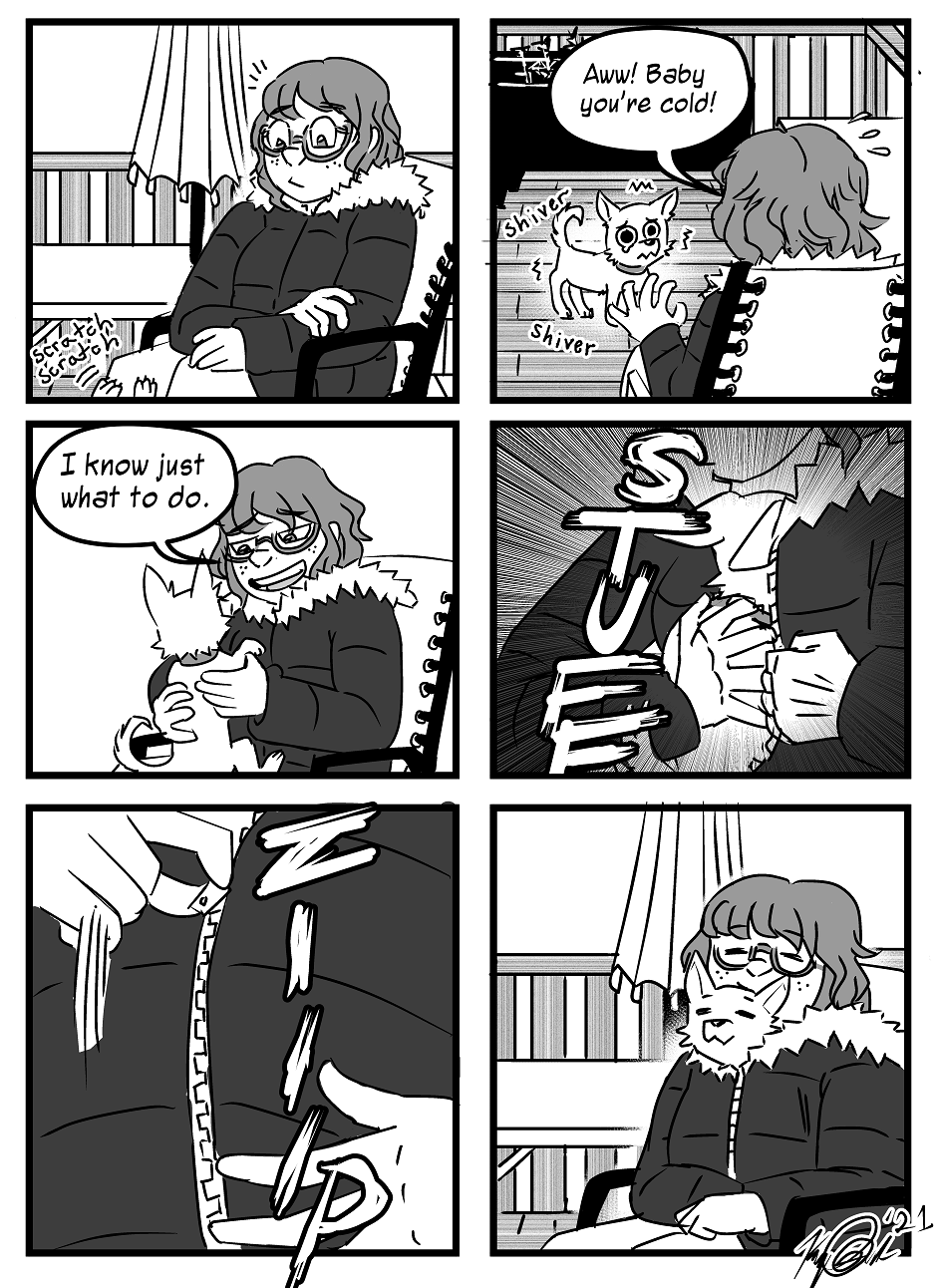 yeah lemme just shove my little dog, Baby into my coat like a joey cause it's winter