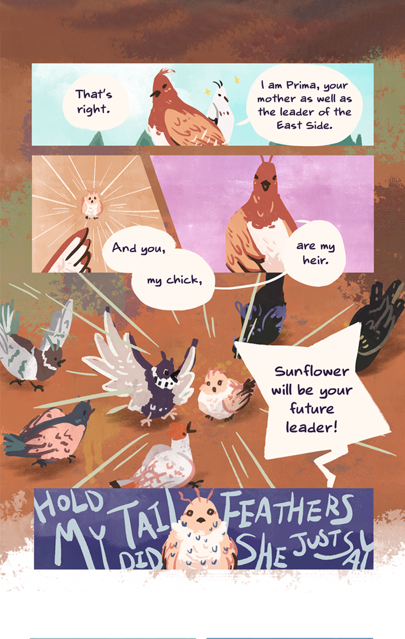 Sunflower, a Coocoo bird raised by a family of Warblers, has always longed for a place where she belongs. Upon leaving the nest, her birth family comes to claim her as the heir to East Side Coocoos, the greatest bird mafia in the city.