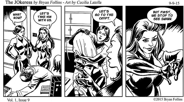 The JOkeress comic strip is an adaptation of The Jokeress indie ebook series by Bryan Follins and Margaret Henderson.