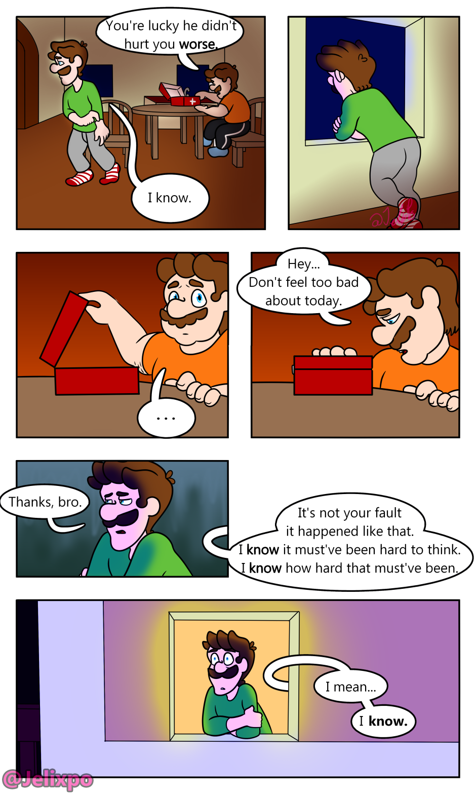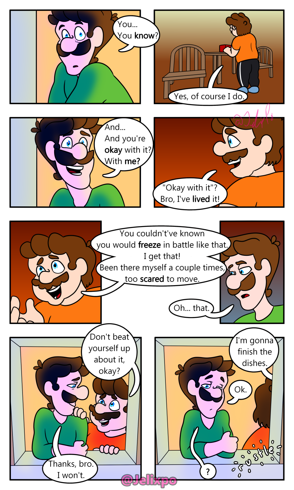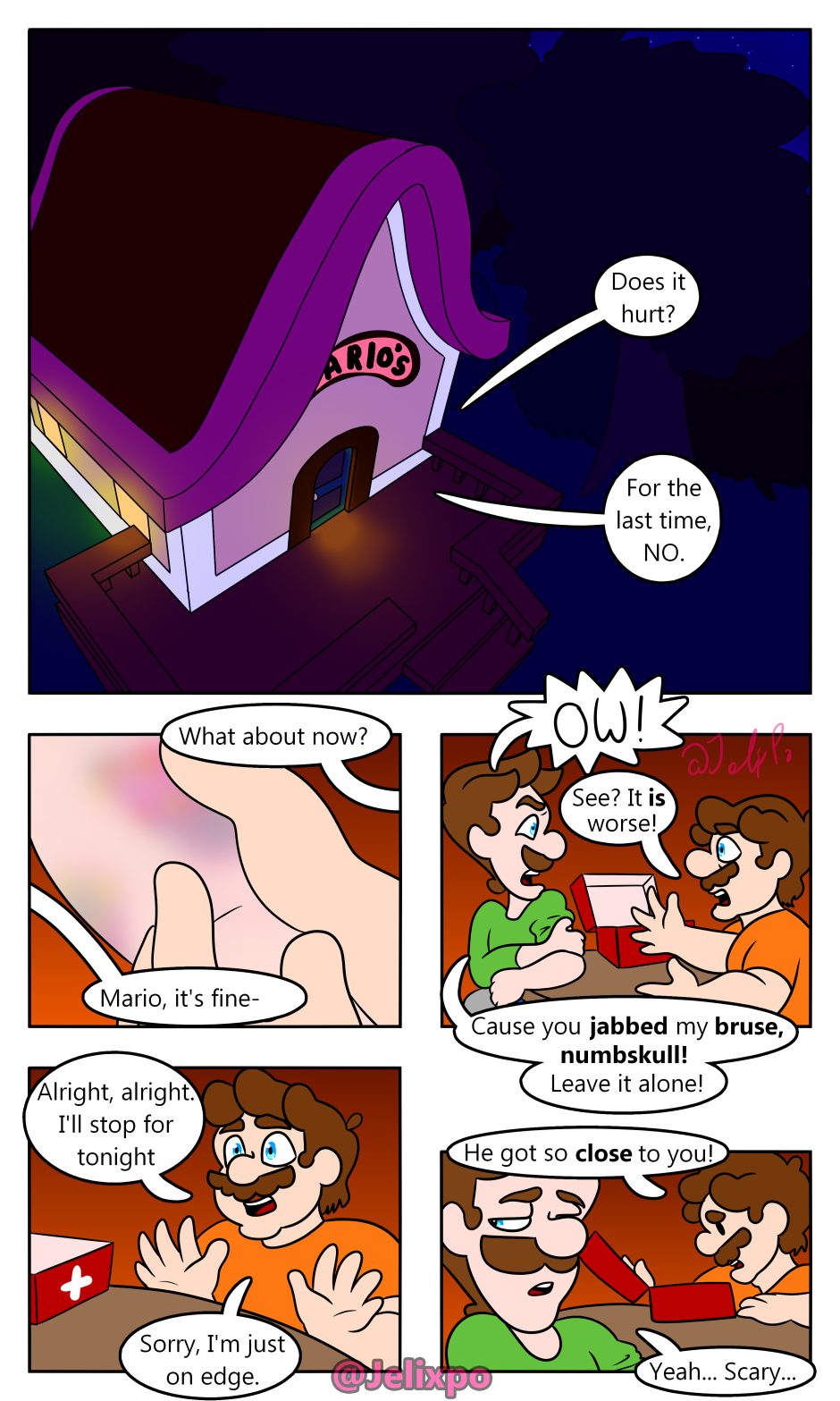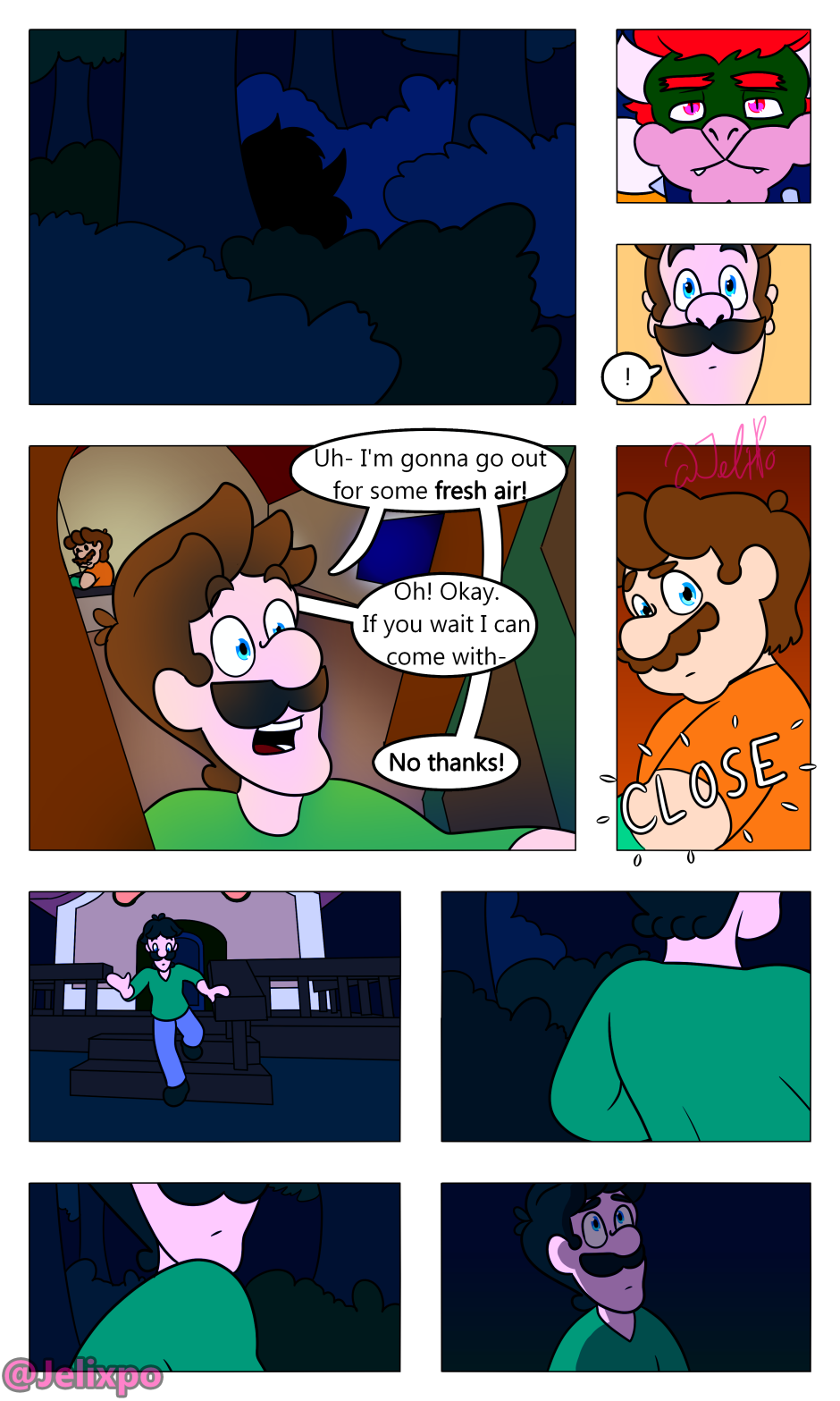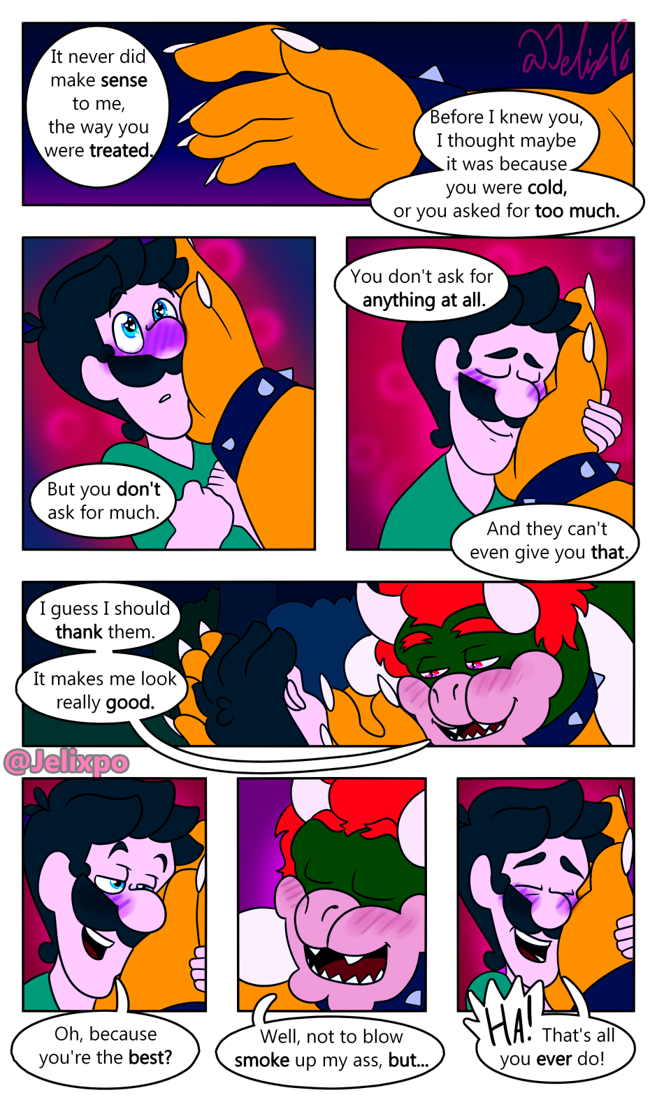 Amazing, re-reading this a third time while waiting for the next chapters. Always loving, incredible and fascinating, by the way. Mario's face in the last panel is undoubtedly priceless, it's not every day you sneak up on your brother and your nemesis making out.
