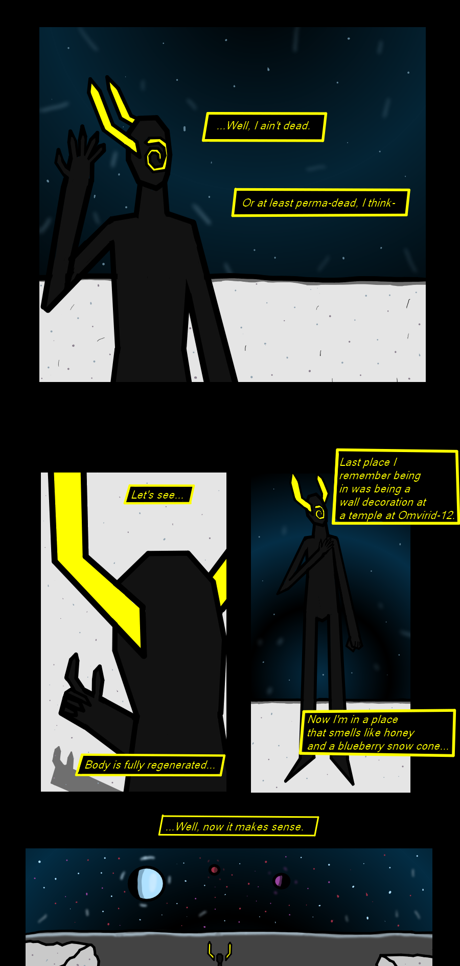 Having regained his consciousness from his battle with Thanatos at Omvirid-12, Zackarack finds himself awakening in a rather familiar location.