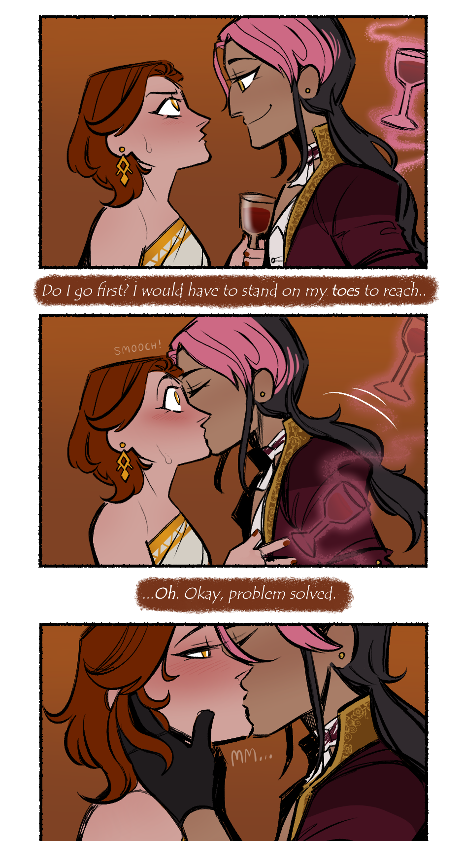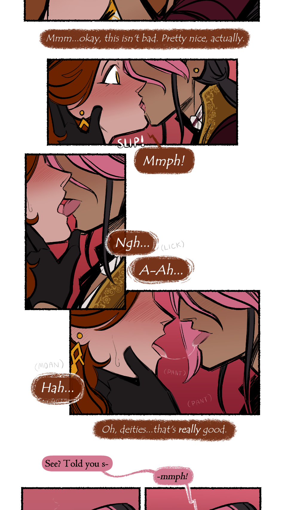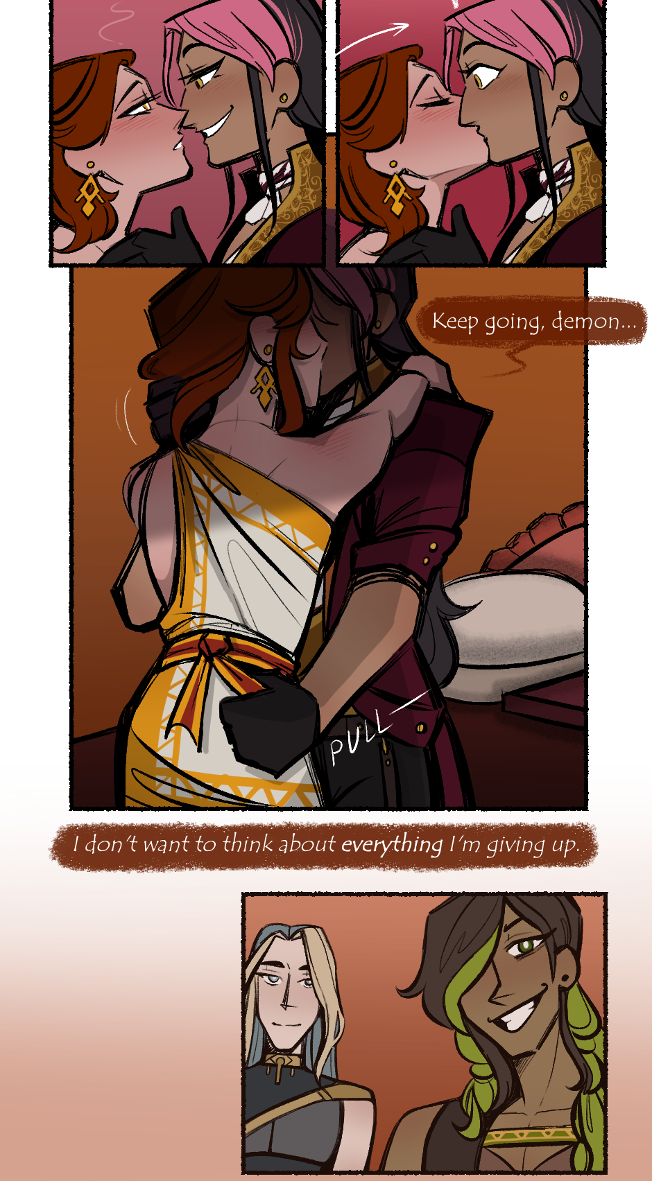 though nothing explicit happens, this page has a mature warning for some making out and the last panel IMPLIES that sexual things are to follow. the only 'plot relevant' thing is onuspe thinking about his family/friends and deciding that he's gonna use sex as a distraction. you can find JUST those panels here: https://drive.google.com/drive/folders/1Wq0CYWPP7jXEQB7Q_ZjVEjibs4Gp6NCF?usp=sharing
