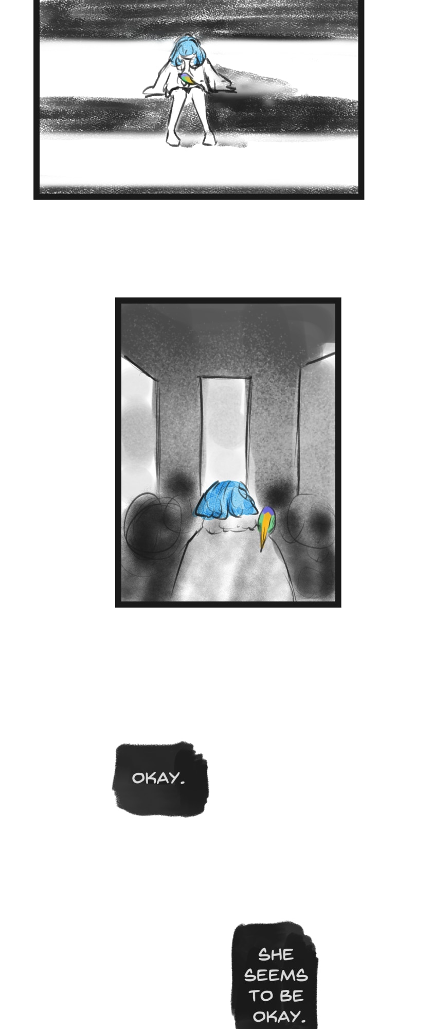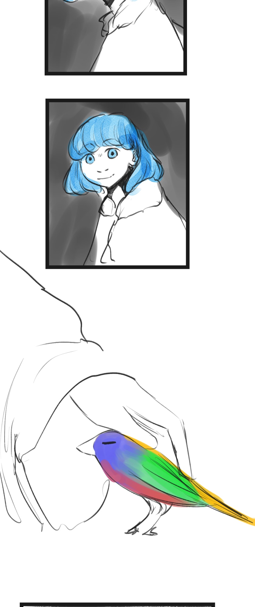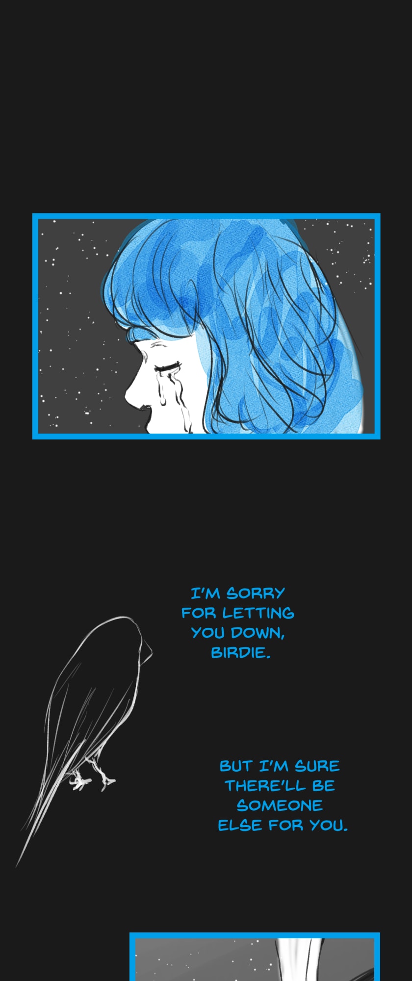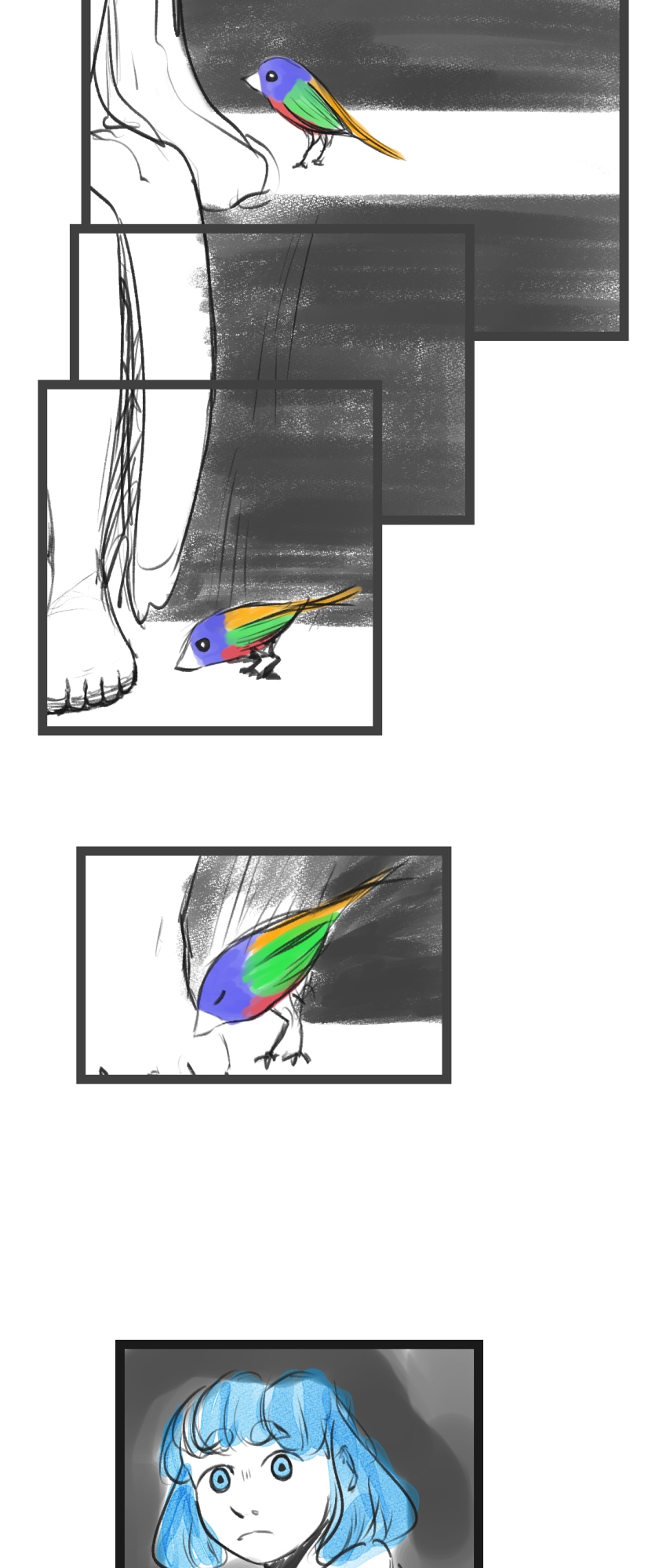 In a state of hopelessness and despair, a blue-haired girl, who was put into involuntary sex work, wants to escape the place she's stuck in. She feels imprisoned, and wishes to be freed. Then, one day, a little bird with the ability to open "frames" - portals from one place to another - fulfils her wish.