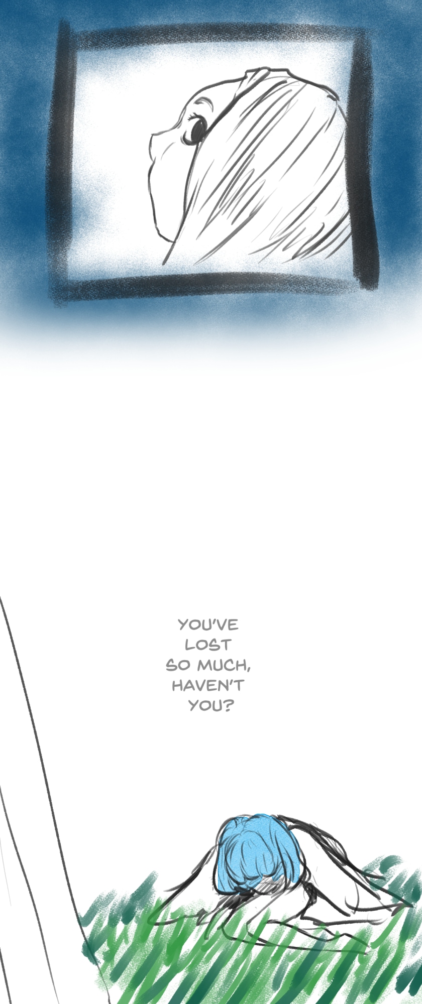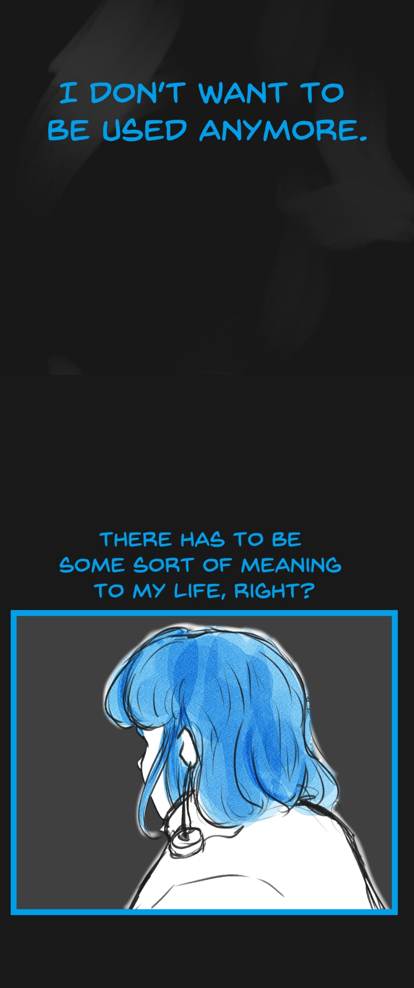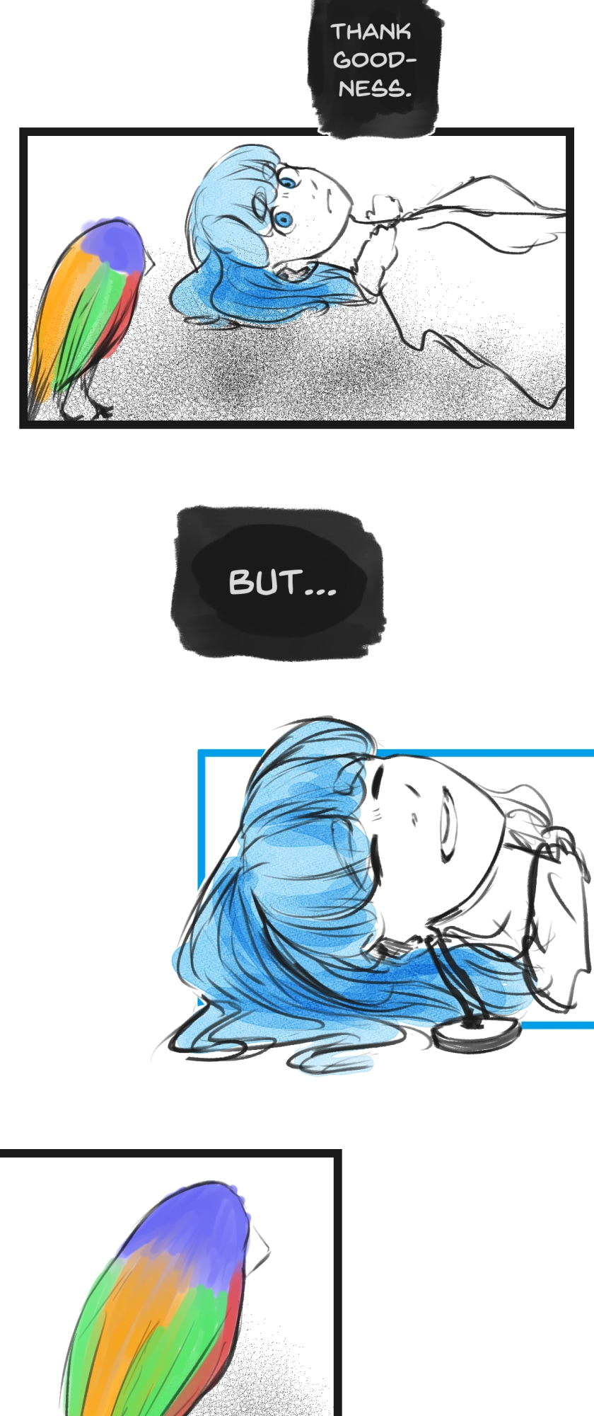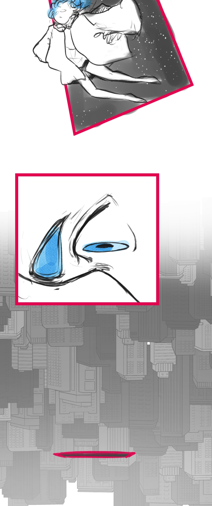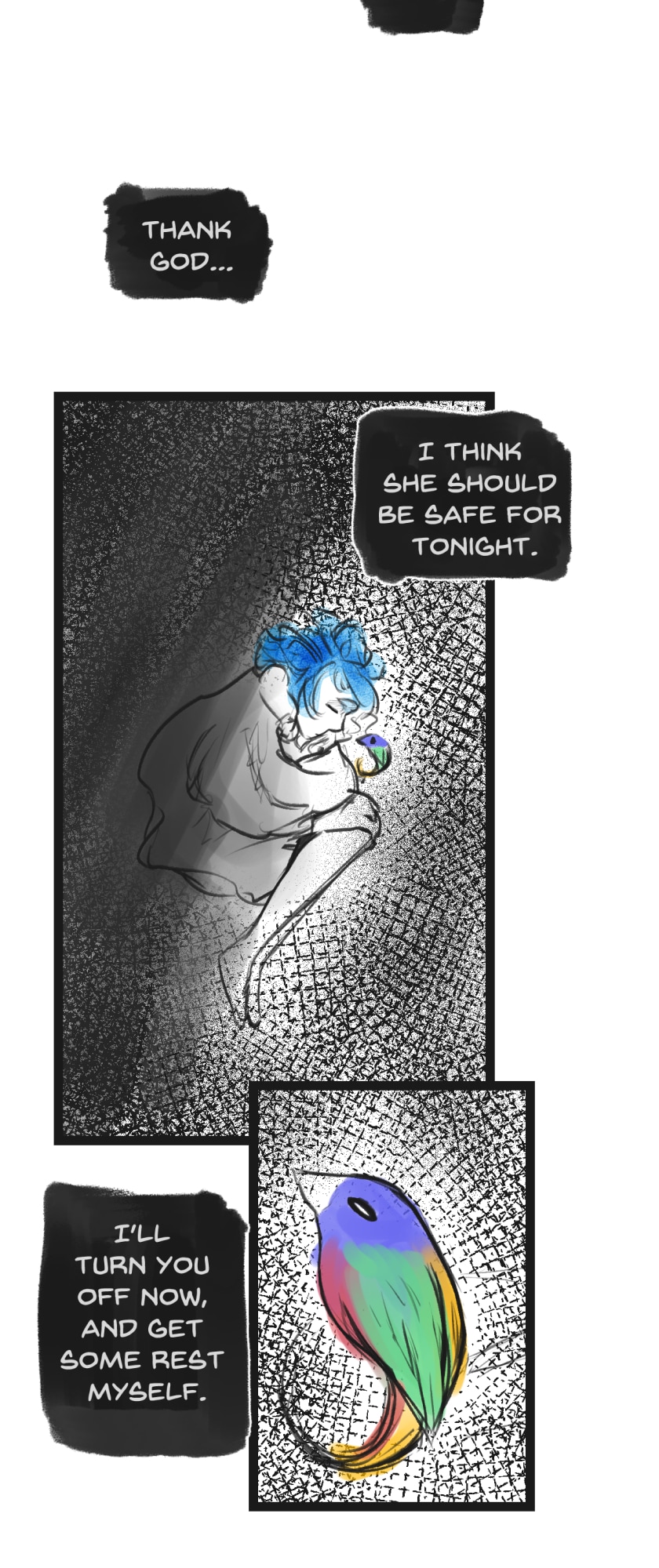 In a state of hopelessness and despair, a blue-haired girl, who was put into involuntary sex work, wants to escape the place she's stuck in. She feels imprisoned, and wishes to be freed. Then, one day, a little bird with the ability to open "frames" - portals from one place to another - fulfils her wish.