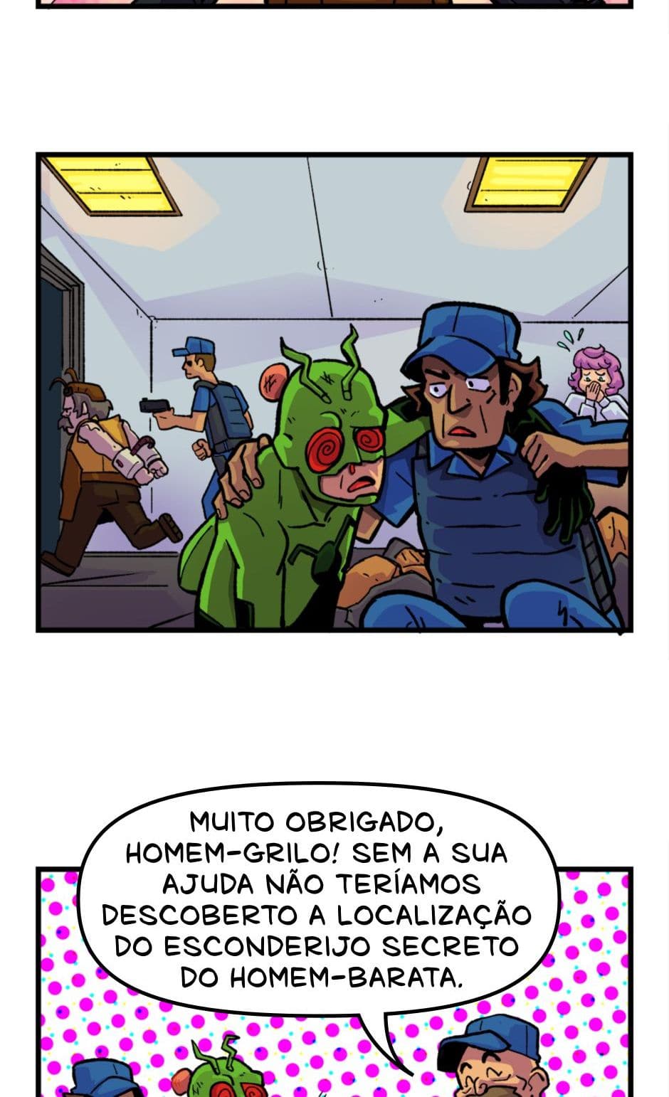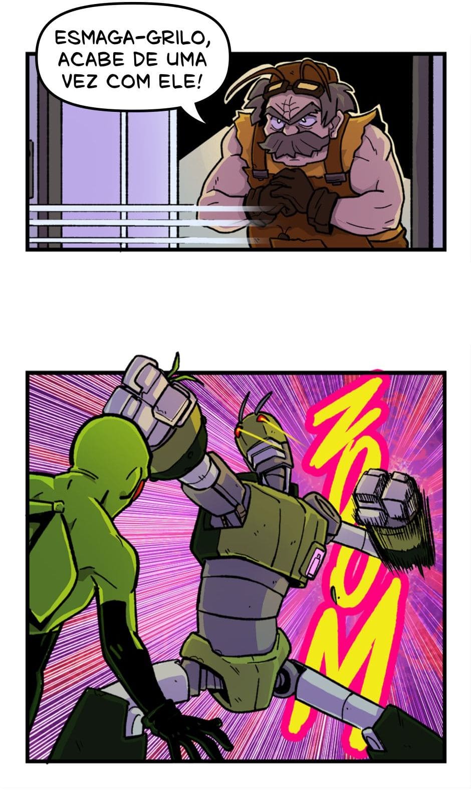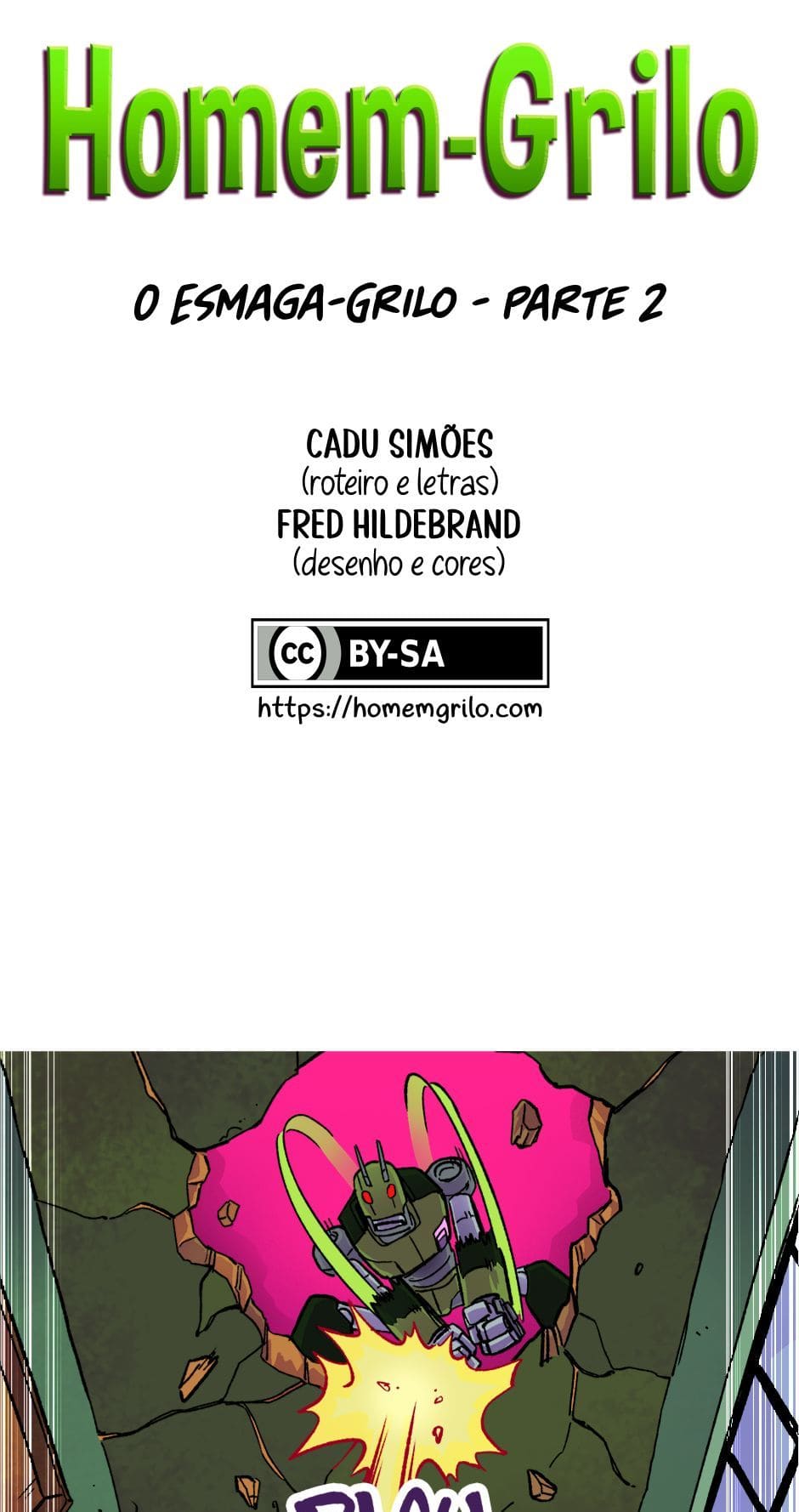 Tem início o confronto entre o Homem-Grilo e o Esmaga-Grilo. Roteiro e letras por Cadu Simões. Desenho e cores por Fred Hildebrand.