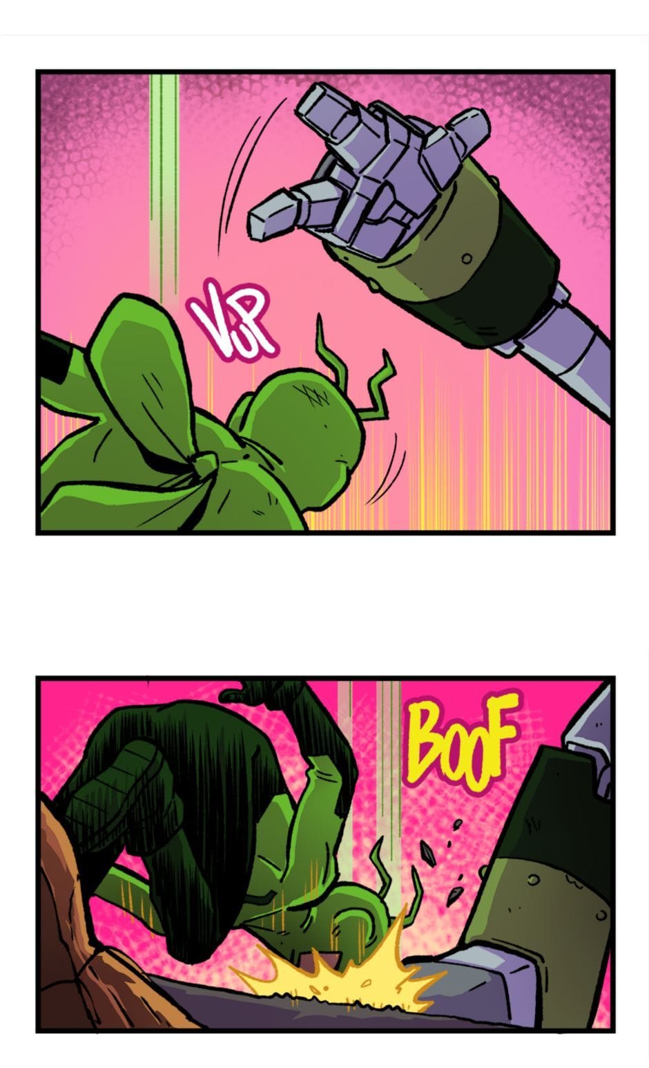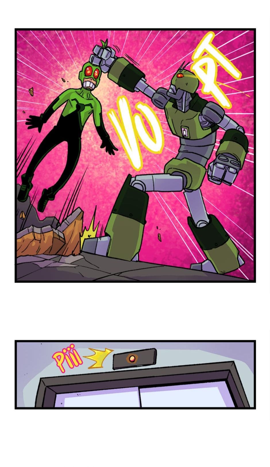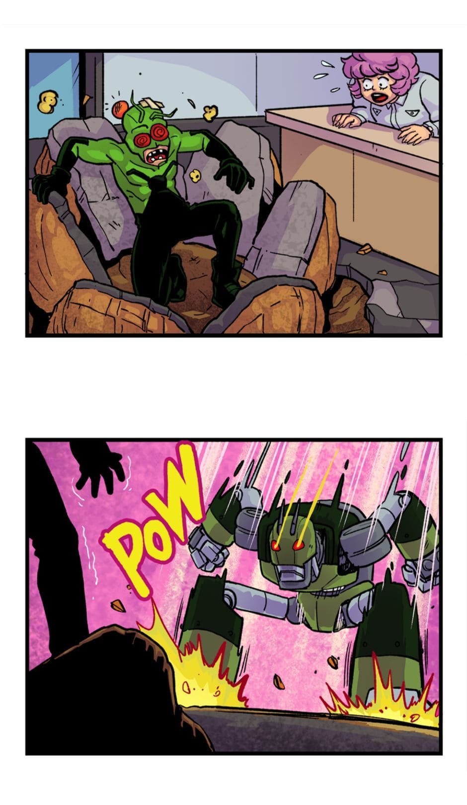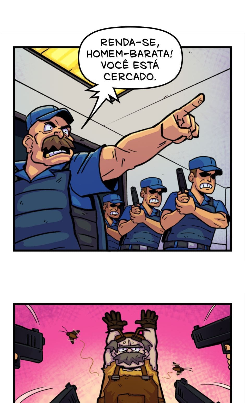 Tem início o confronto entre o Homem-Grilo e o Esmaga-Grilo. Roteiro e letras por Cadu Simões. Desenho e cores por Fred Hildebrand.