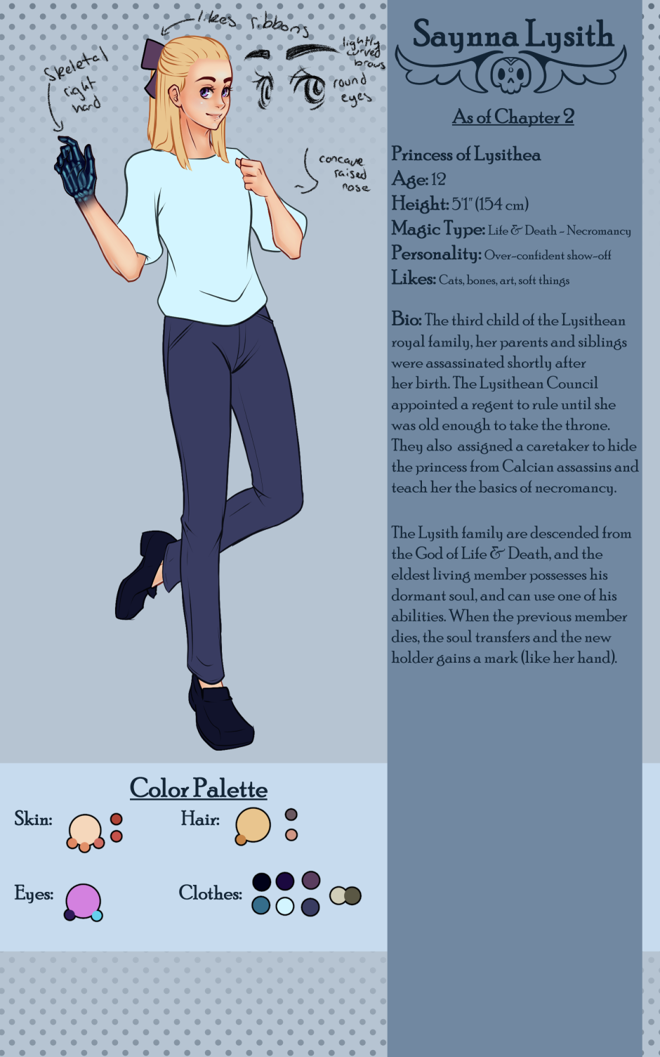 In a world plagued by the curses and turmoil left behind by a divine war, Saynna Lysith is the only living descendant of the Death God. After befriending an assassin, she learns that there are many who plot against her, and others who wish to use her to revive the gods.