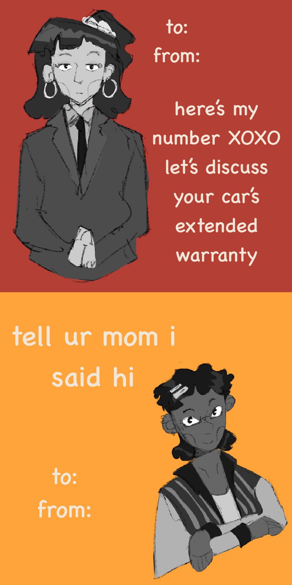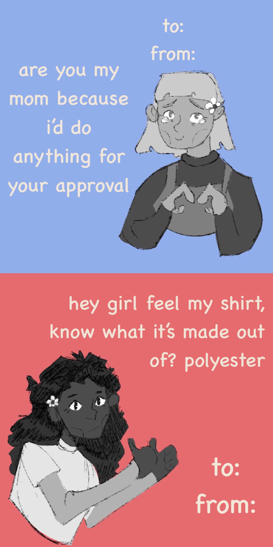 also yes the last three are characters that haven't appeared yet but they might depending on whether/how i continue the comic. for now the characters in order: lilith (she/her), juniper (she/they), marcy (she/her), faun (they/him), willow (she/her). marcy and faun are lilith’s best friends and willow is her mother.