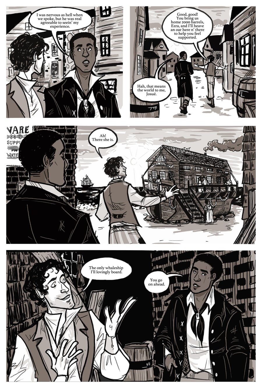 Panel 1 [Ezra looks over at Josué, shot over Josué’s shoulder. In the background, the flurry of the docks is fading away as they move further inland.]