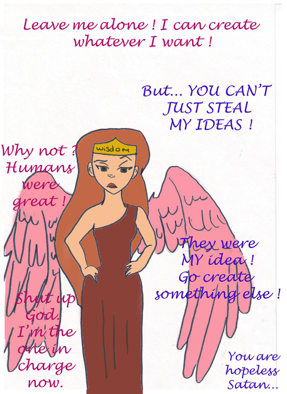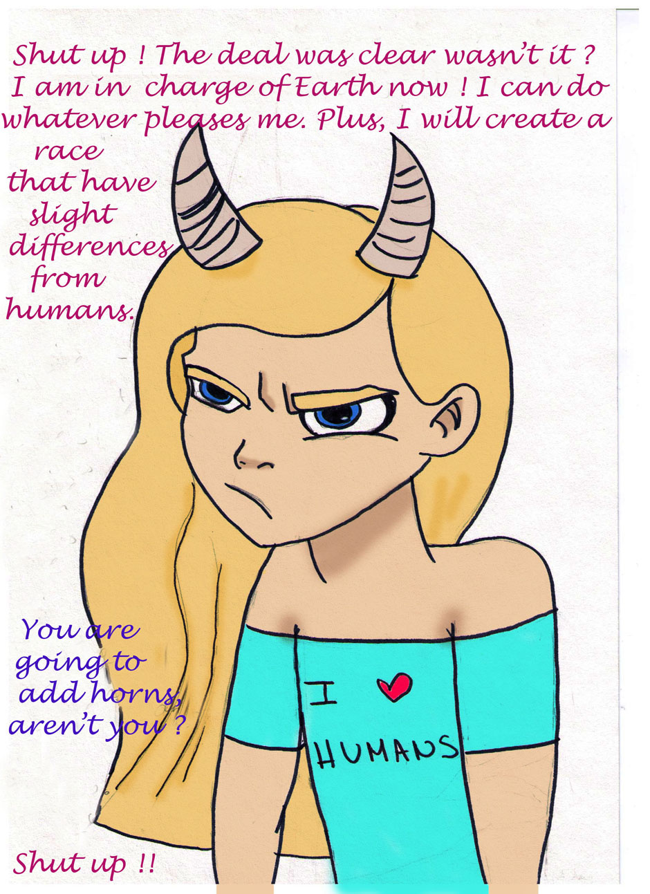 Satan and God exchange their roles every new earth, but here, Satan seems to REALLY like God's humans. Yep... No background, I really am lazy :p