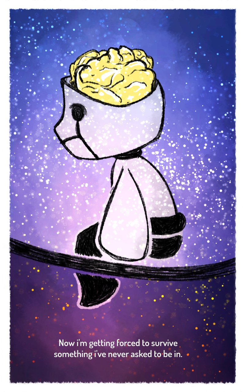 But when the little robot stumbles her, after suddenly awakening alone in vast space, it wonders if his place in this life is to be a human.