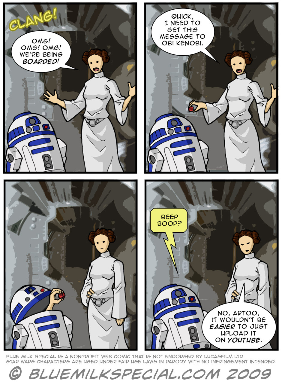 Blue Milk Special is a sci-fi parody webcomic focusing on Star Wars but not limited to it. Other elements from pop culture that appear include Star Trek, Futurama, Doctor Who, Battlestar Galactica. Blue Milk Special produces free pop culture parody webcomics and promotes charity organizations like the 501st Legion and Rebel Legion as well as Stand Up to Cancer. Our goal is to make people laugh as well as to broaden awareness of ways to help people in need. We are non-profit and produce the webcomic under Fair Use law for parody with no infringement.