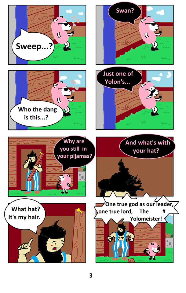 In a distant land at another universe in the multiverse, lives a pink sheep Sweep, his best friend Swan, a human, and his pet giraffe Girweg. The last swags on the land of Swagaria, as they witnessed the capture of their people by the yolos, led by their evil semigod, Yolon. Yolon and his Prophet along with the Yolomeister are determined to capture all the swags and take the land of Swagaria as they own. But nobody knows that in the background, a more sinister power is gathering their strength to reach their mysterious goal. Now Sweep and Swan is on the way to rebuild Swagville, their town, outside the reach of the yolos, but they will have a hard time to do it, thanks to all the miseries i will put them into. :P