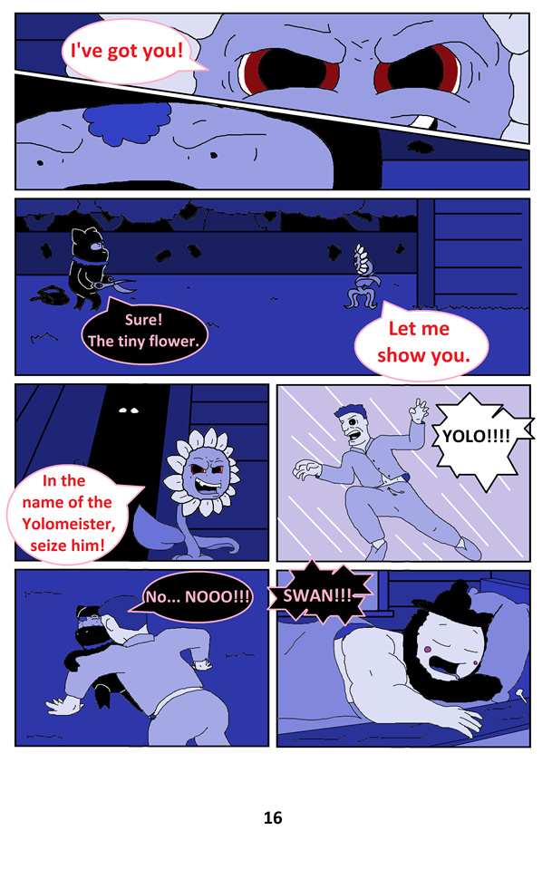 In a distant land at another universe in the multiverse, lives a pink sheep Sweep, his best friend Swan, a human, and his pet giraffe Girweg. The last swags on the land of Swagaria, as they witnessed the capture of their people by the yolos, led by their evil semigod, Yolon. Yolon and his Prophet along with the Yolomeister are determined to capture all the swags and take the land of Swagaria as they own. But nobody knows that in the background, a more sinister power is gathering their strength to reach their mysterious goal. Now Sweep and Swan is on the way to rebuild Swagville, their town, outside the reach of the yolos, but they will have a hard time to do it, thanks to all the miseries i will put them into. :P