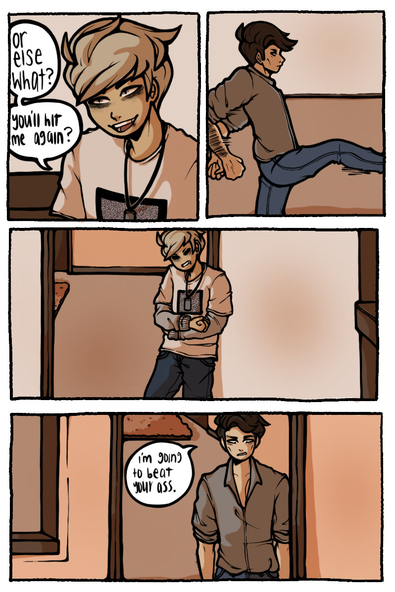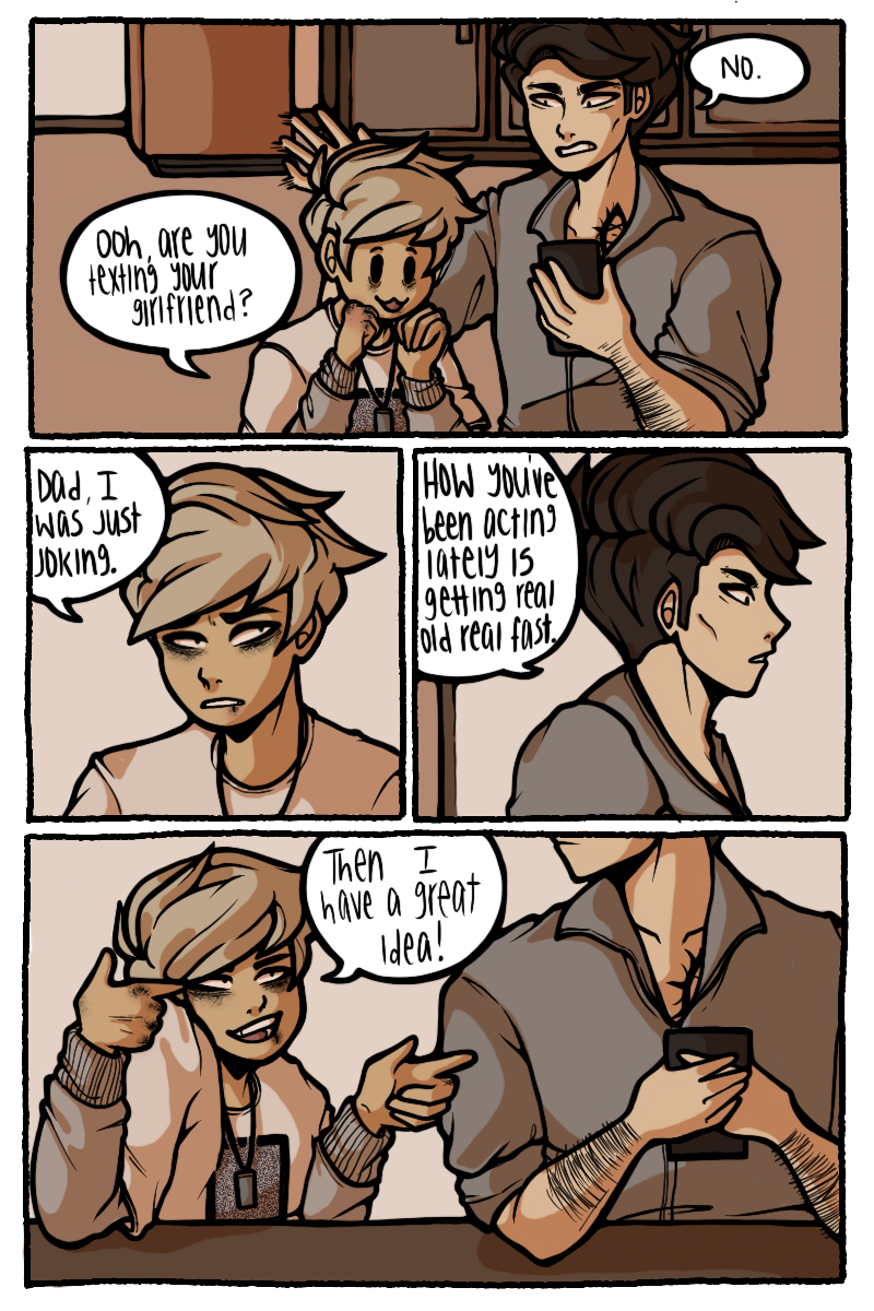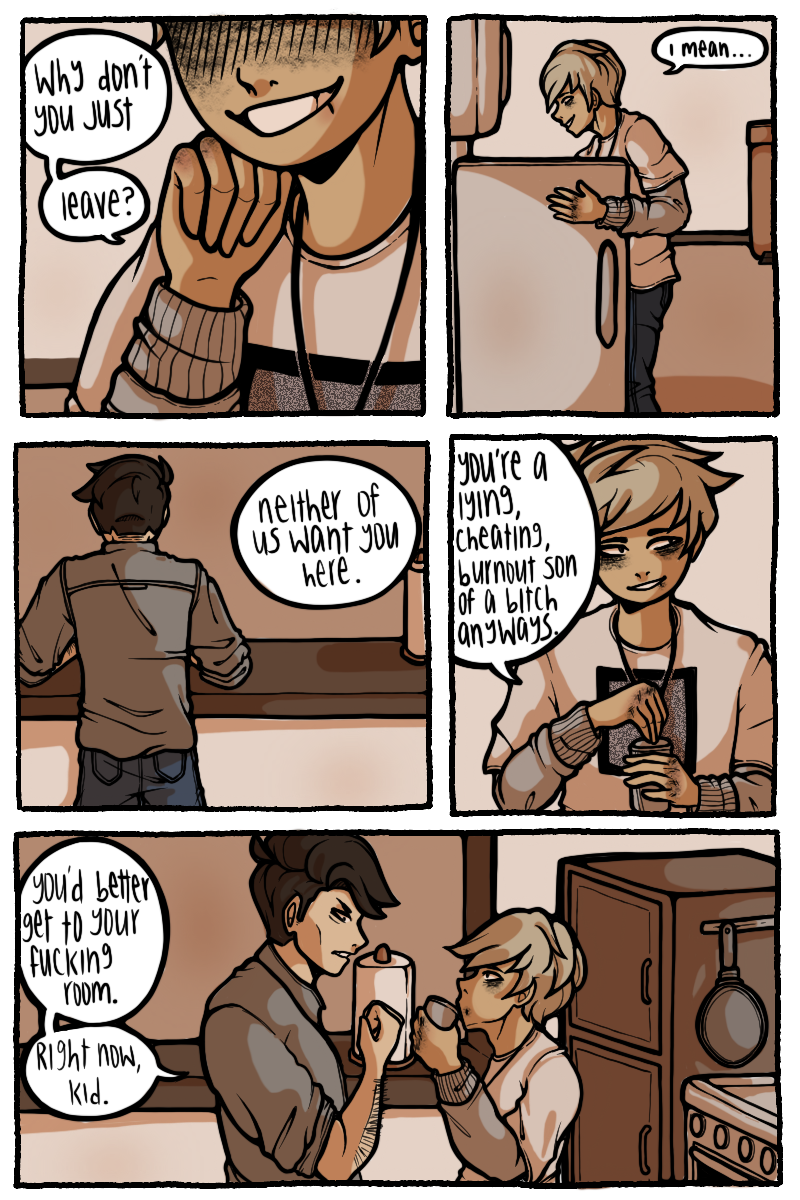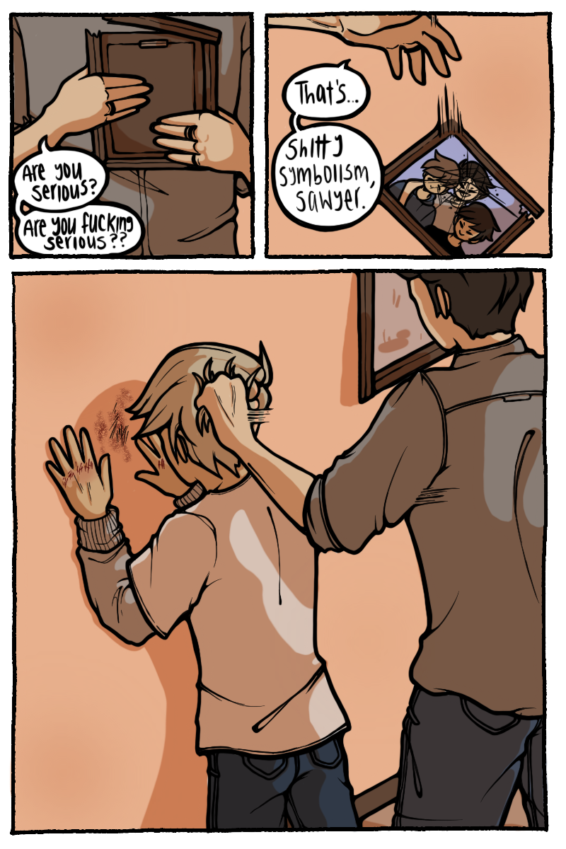 Sawyer was raised by his dads as more of a colleague than a child. With one dad being almost completely absent and his other having a bad grasp on any anger control, Sawyer quickly became a violent problem child. 15 years of acting out and a broken family photo led to the permanent loss of his eye in an accident. Unbeknownst to Sawyer, a god had been keeping an eye on him since his youth. This god offers to help Sawyer get revenge on his dad, but they probably don't only have good intentions.