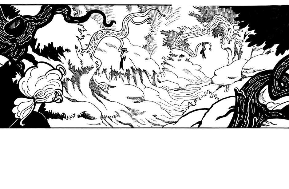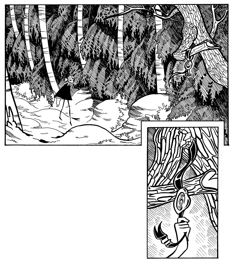 The Scribe talks to a sheep and follows it into the forest, along a path of ribbons.