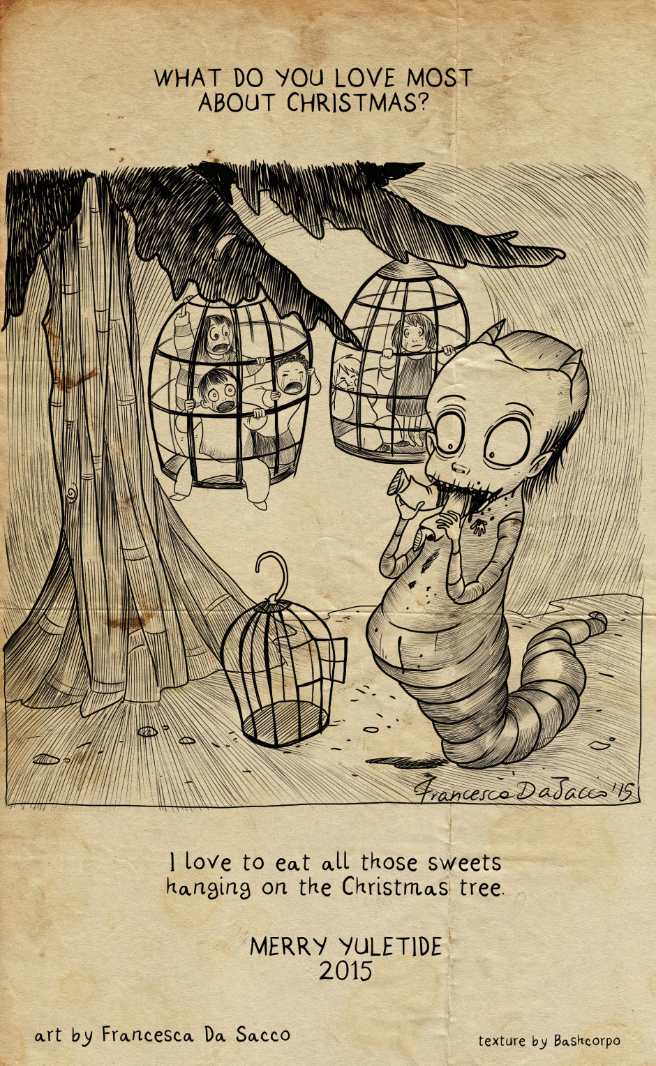 My dear Monsters, young and old, I wish you a very happy Yule with family, friends and all the people you love, no matter if they're dead or alive. Whatever you eat, eat a lot! :D love, Francesca *** Are you enjoying Monsters? Please consider to support me on Patreon. Check out BAMBOLE di CARNE on ISSUU http://issuu.com/francescadasacco/docs/bambole_di_carne it's free (but Italian only XD I'm working on a translation).