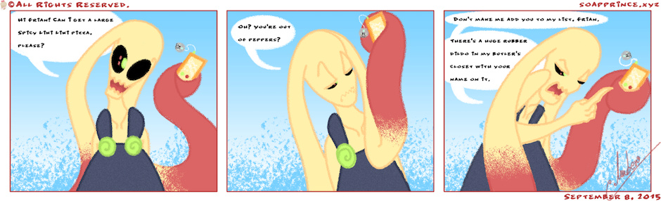 Soap Prince is a weekly comic strip about the life of a deranged monster in a world that's basically Wonderland on crystal meth. Abandon all dignity and shame, ye who enter here.