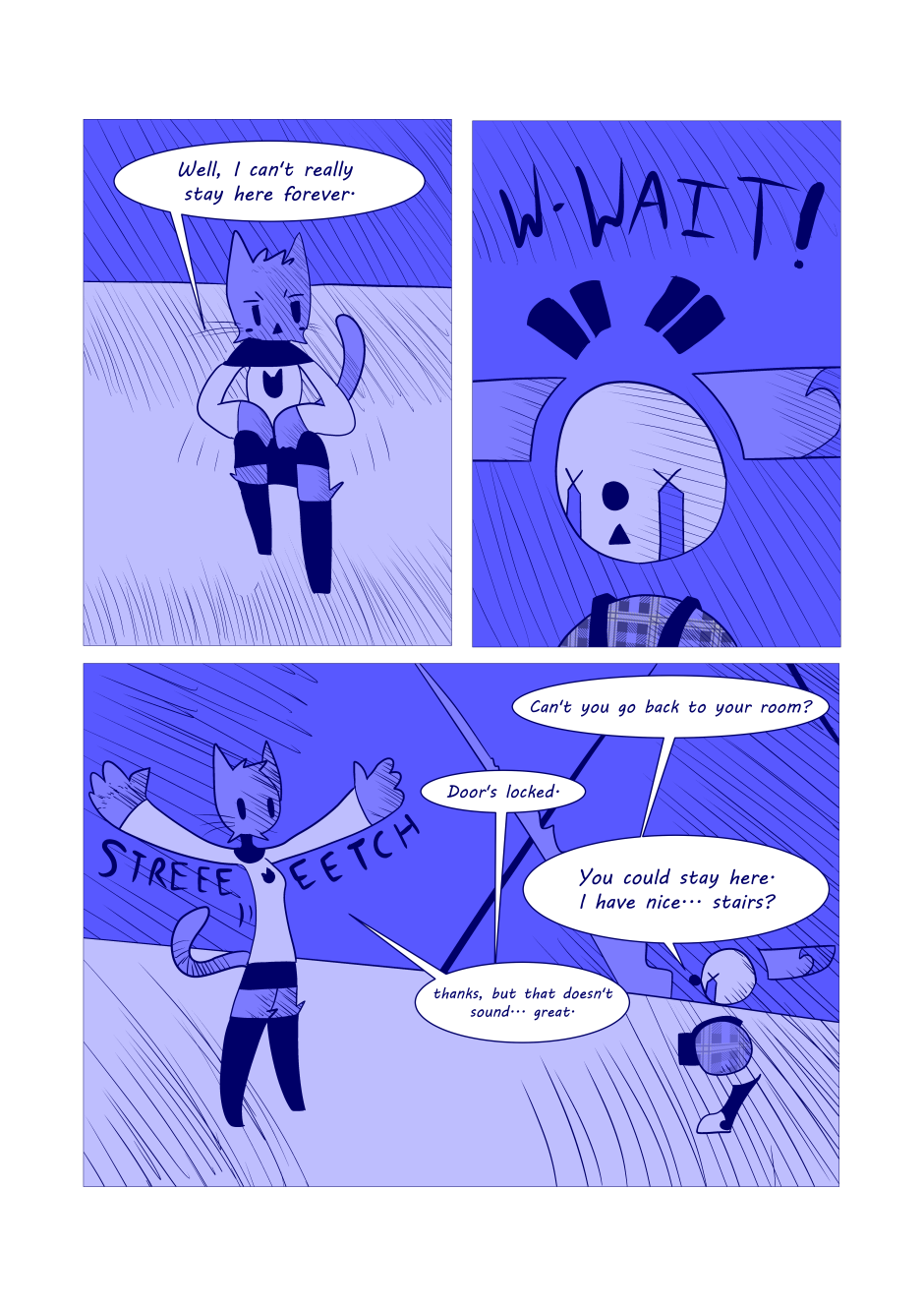 A catlike protagonist wakes up to find themselves asleep, and meets a colorful cast on their journey to waking up; a clown, some talking meat, a dream copy of her younger brother, and a rabbit that claims to be in the same never-ending-dream situation. Along the way, she learns to trust people she should, fear things she should fear, and maybe just enjoy the moment sometimes as she moves from dream to dream.