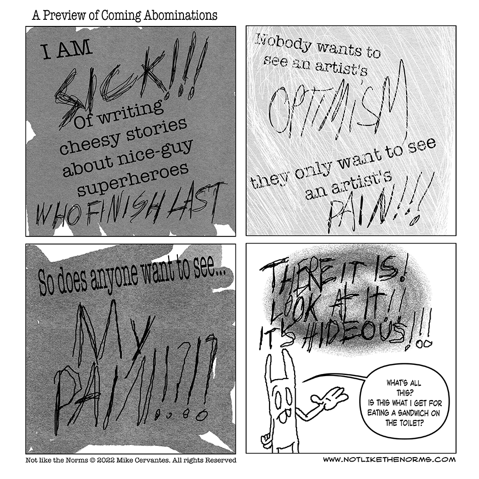 Norm Ynaryck (or Jeddy to his friends), struggles with neurodivergence, depression, and the inability to fit in with others, filtered through stories of his past or concoctions of his fantasies. A semi-autobiographical ongoing webcomic by Mike Cervantes.