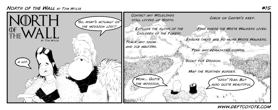 This comic strip features Jon Snow and Tormund Giantsbane following the events of the show as they travel and explore what's north of the wall. The series focuses on two friends pulling pranks on each other and having a good time. There are still mysteries to solve in Westeros, but they don't take the adventure too seriously.