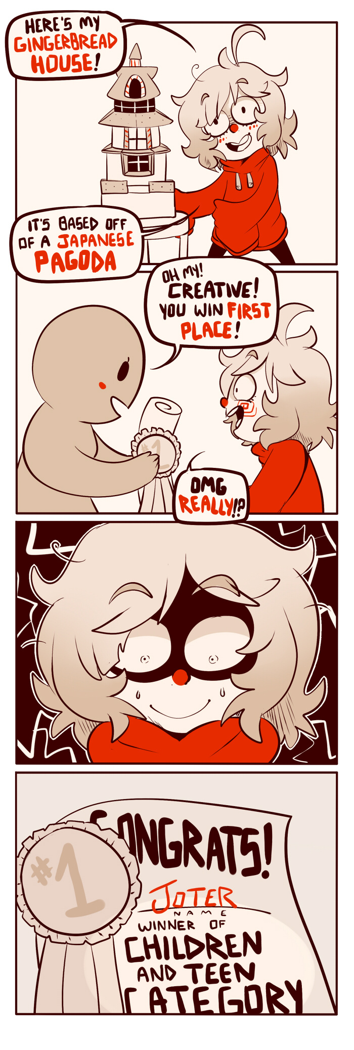 I won a gingerbread house contest recently, and even after I said I was a college student they threw me into the children category.... (and they even spelled my name wrong)