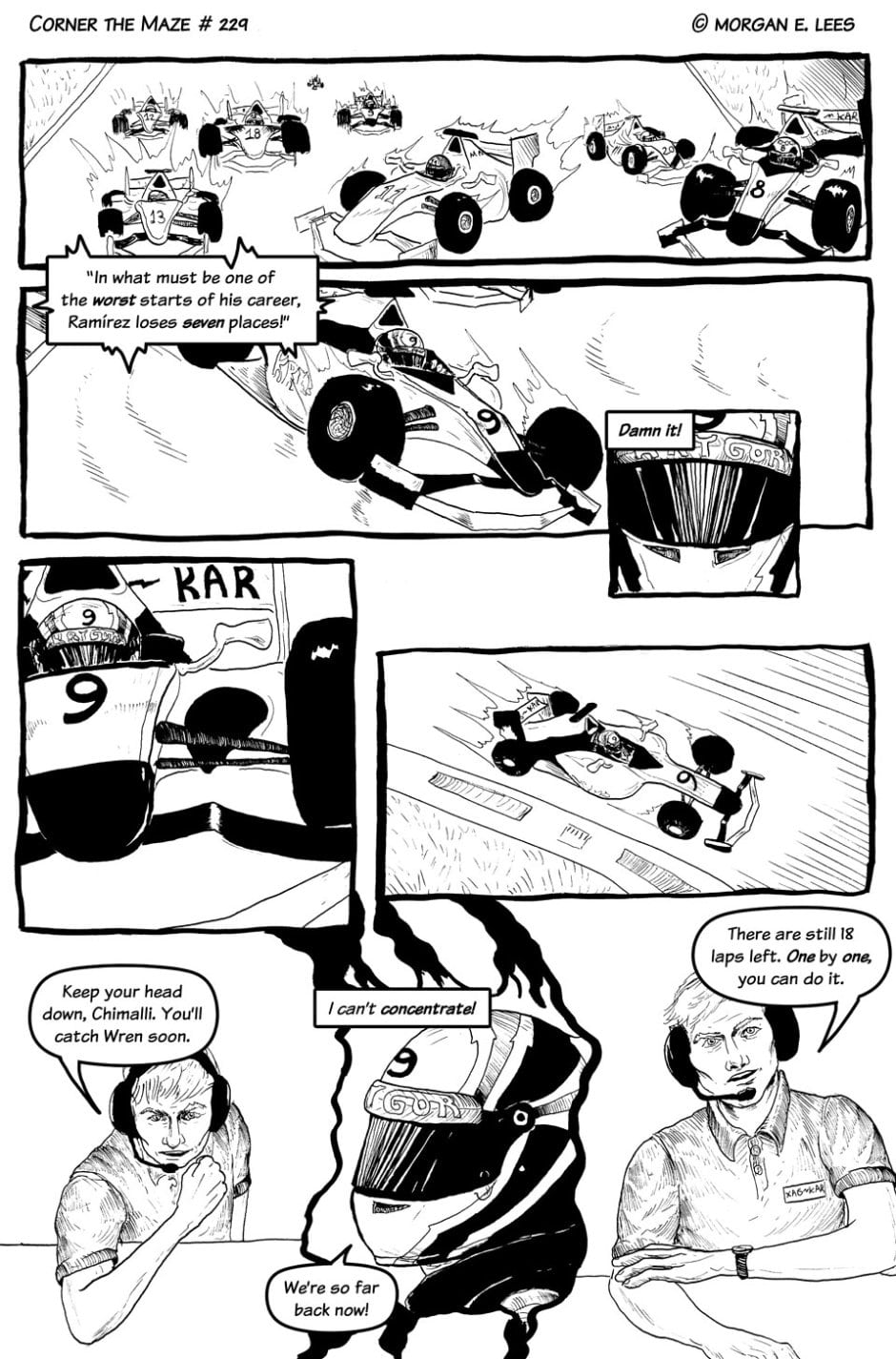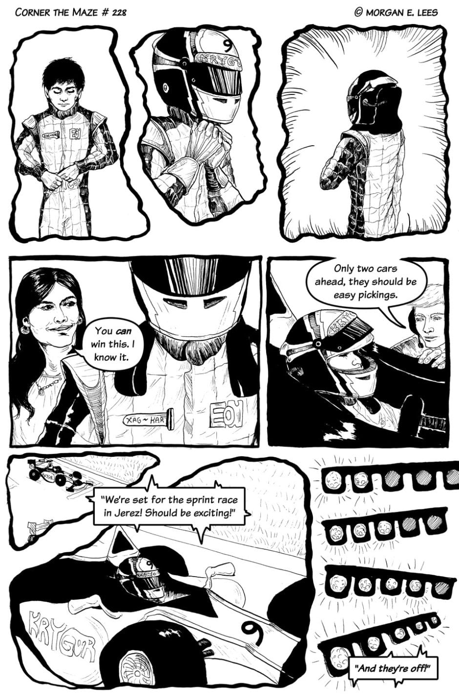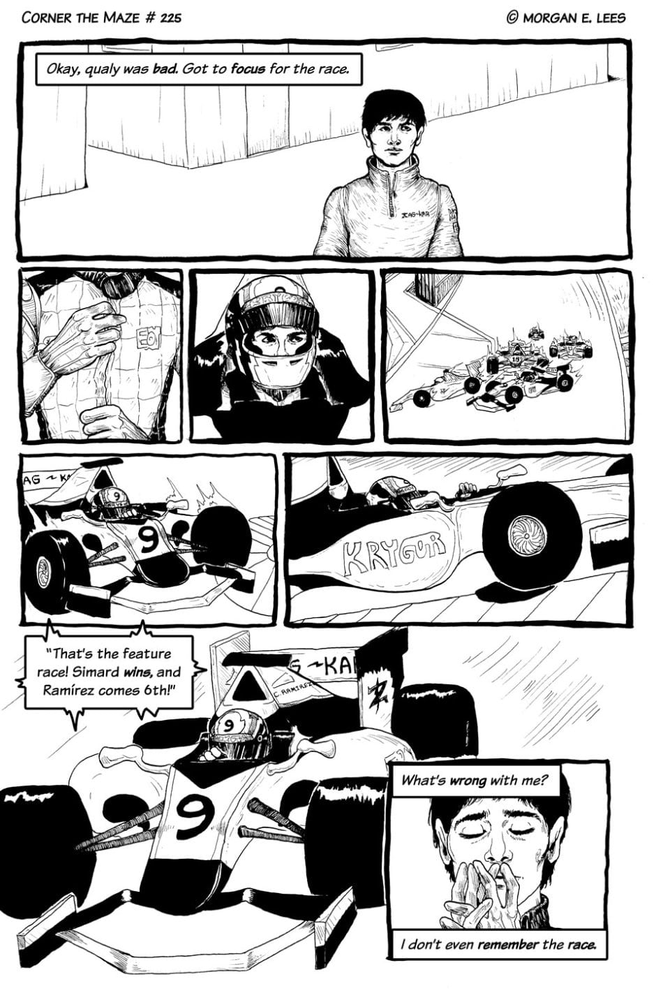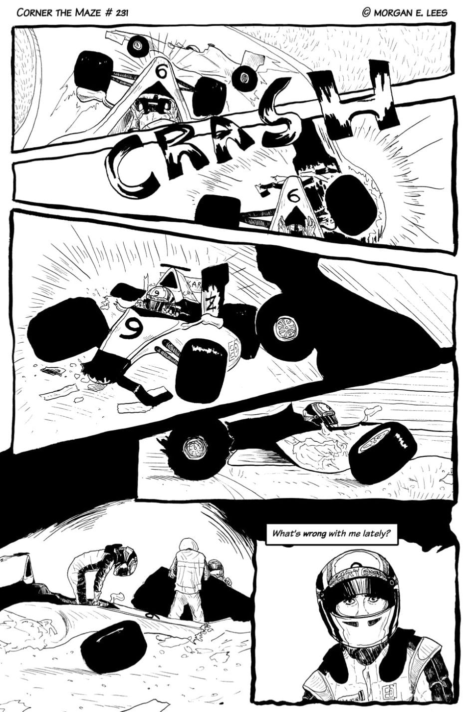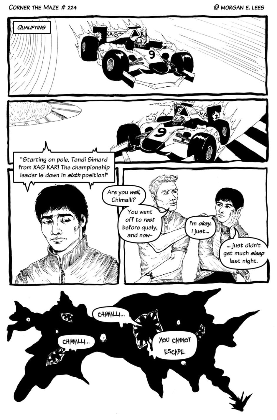 Corner the Maze is an urban fantasy comic following Chimalli Ramírez, a racing driver who has found himself stranded in another dimension after veering off track during a sudden rain storm. He's still not sure whether he hit the wall or actually went through the strange glowing green portal, but either way, he's determined to fight his way back home and finish the race. Completed in 2019.