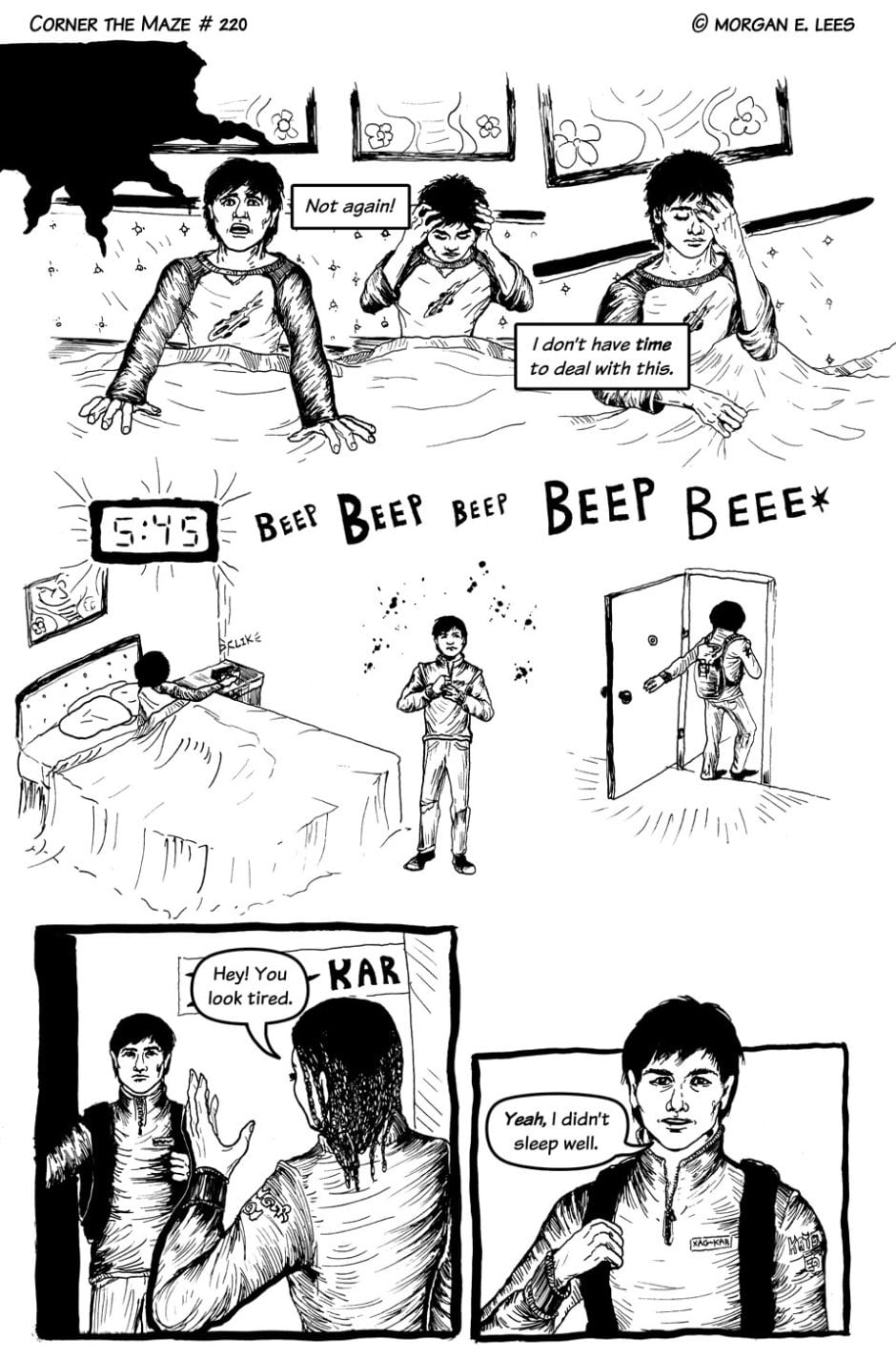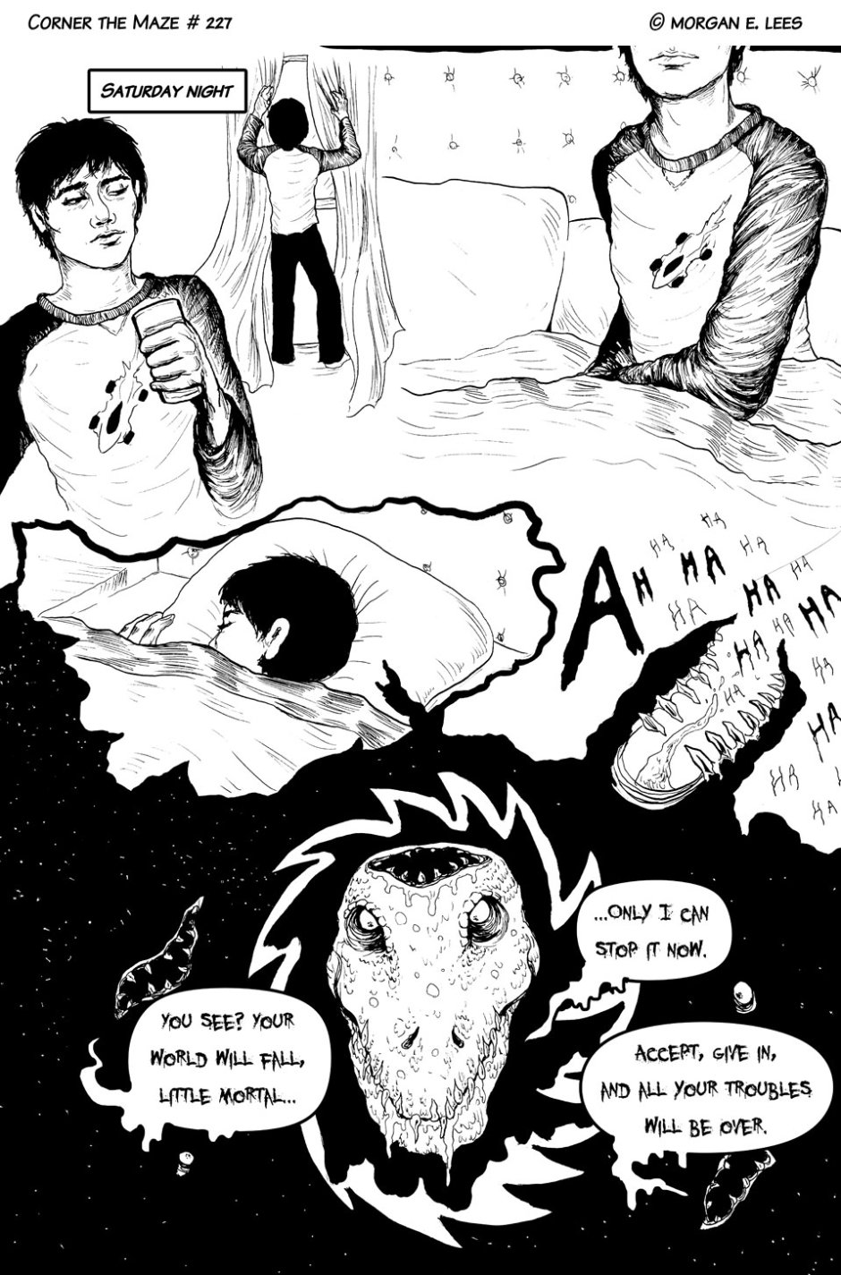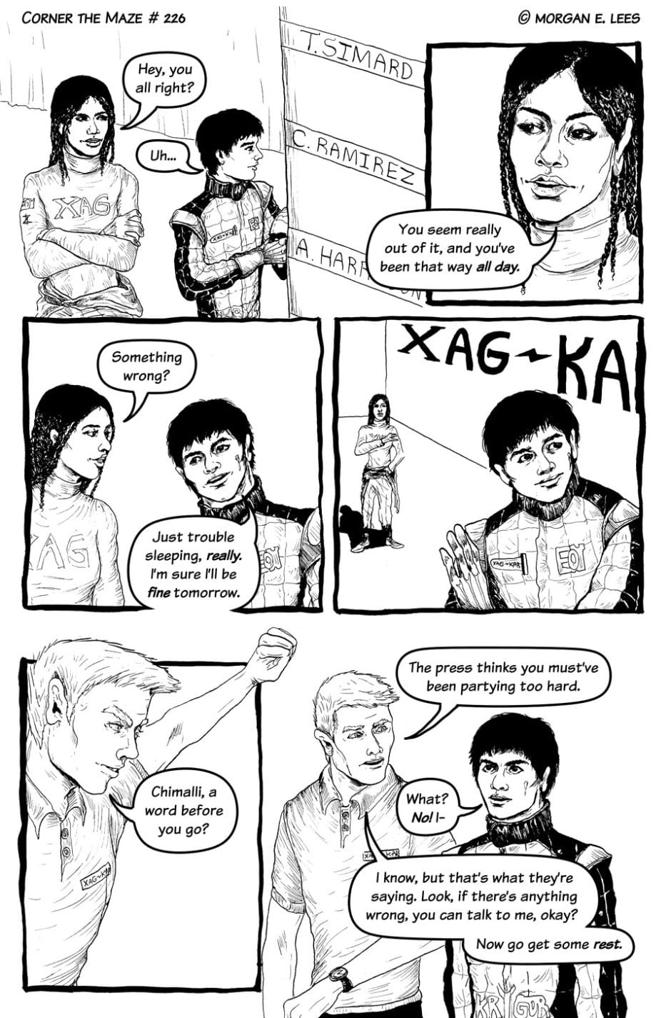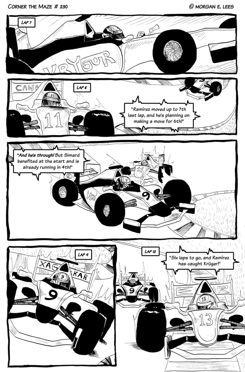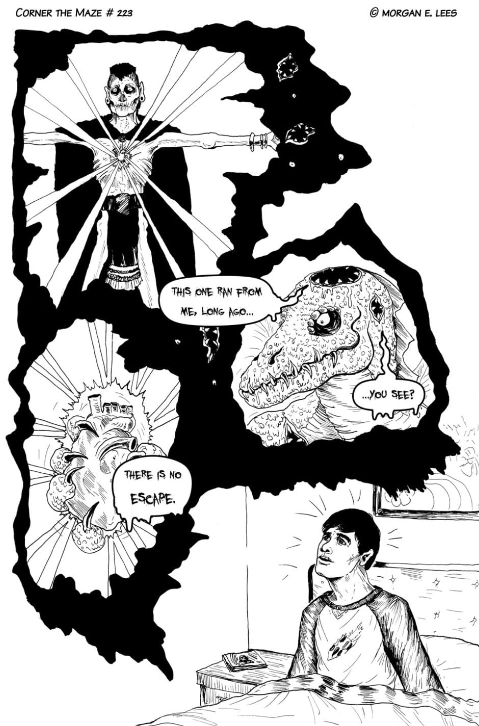 Corner the Maze is an urban fantasy comic following Chimalli Ramírez, a racing driver who has found himself stranded in another dimension after veering off track during a sudden rain storm. He's still not sure whether he hit the wall or actually went through the strange glowing green portal, but either way, he's determined to fight his way back home and finish the race. Completed in 2019.