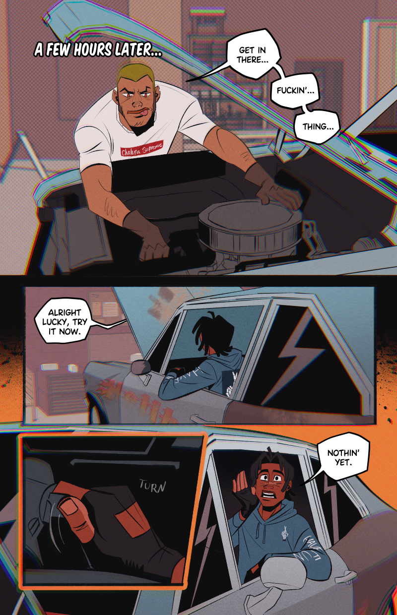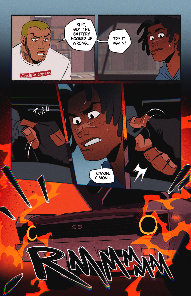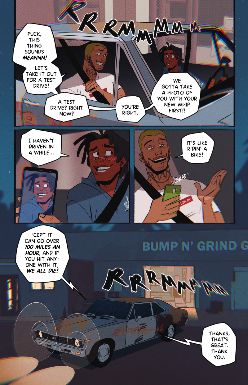 Ride or Die is an LGBTQ webcomic about two street racers who team up with a demon-possessed muscle car in the search for a missing woman, while being hunted by a deadly religious cult.
