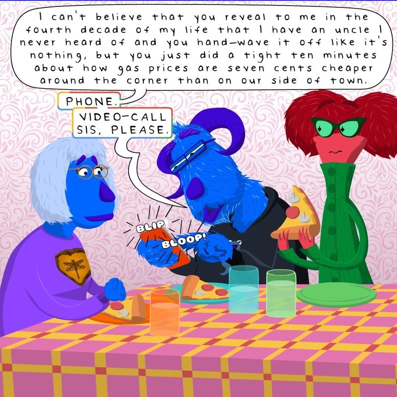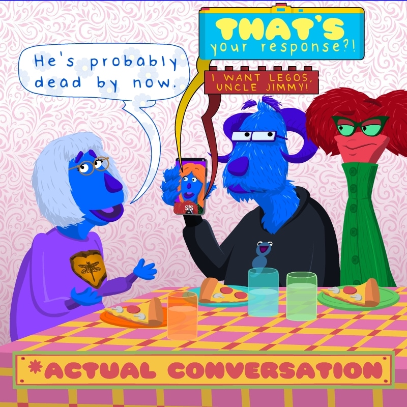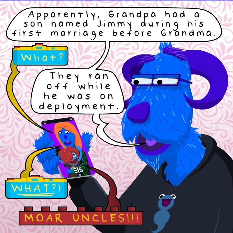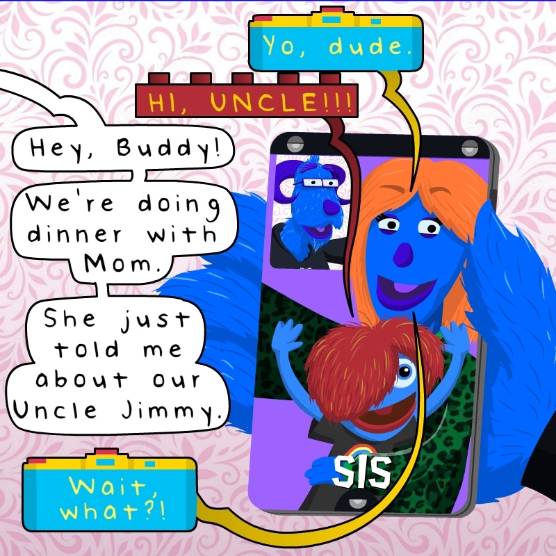 Another Lighthearted strip, again based on an actual conversation we had with my Mom weeks ago. I'm having fun experimenting with stylistic speech bubbles with a Holga camera for the photographer sister camera, a lego for the nephew character, and a Ziggy Stardust lightning bolt for Ginger.Again, if you're out there, Uncle Jimmy, best wishes to you. You have a great-nephew that craves legos