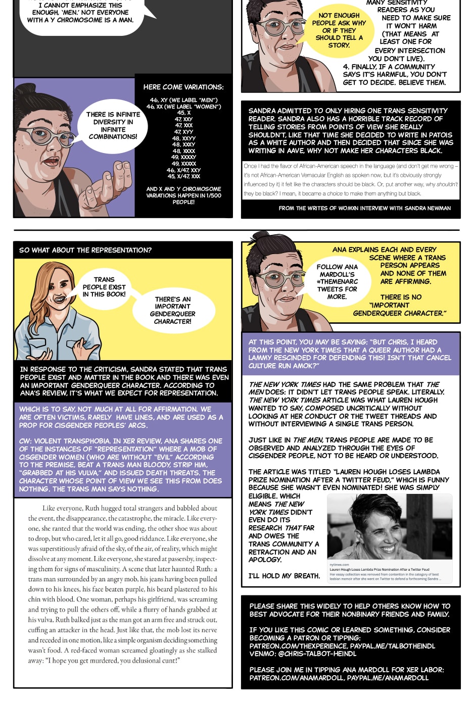 This educomic will explain how disappearing everyone with a "y" chromosome in a book called "The Men" is transphobic in and of itself, give a little biology tutorial, discuss some of the things Ana covered in xer review, and talk about the ridiculousness and irresponsibility of the articles that came out afterward, focusing on The New York Times (although tons of avenues participated, including The Literary Hub). Read more in the educomic.