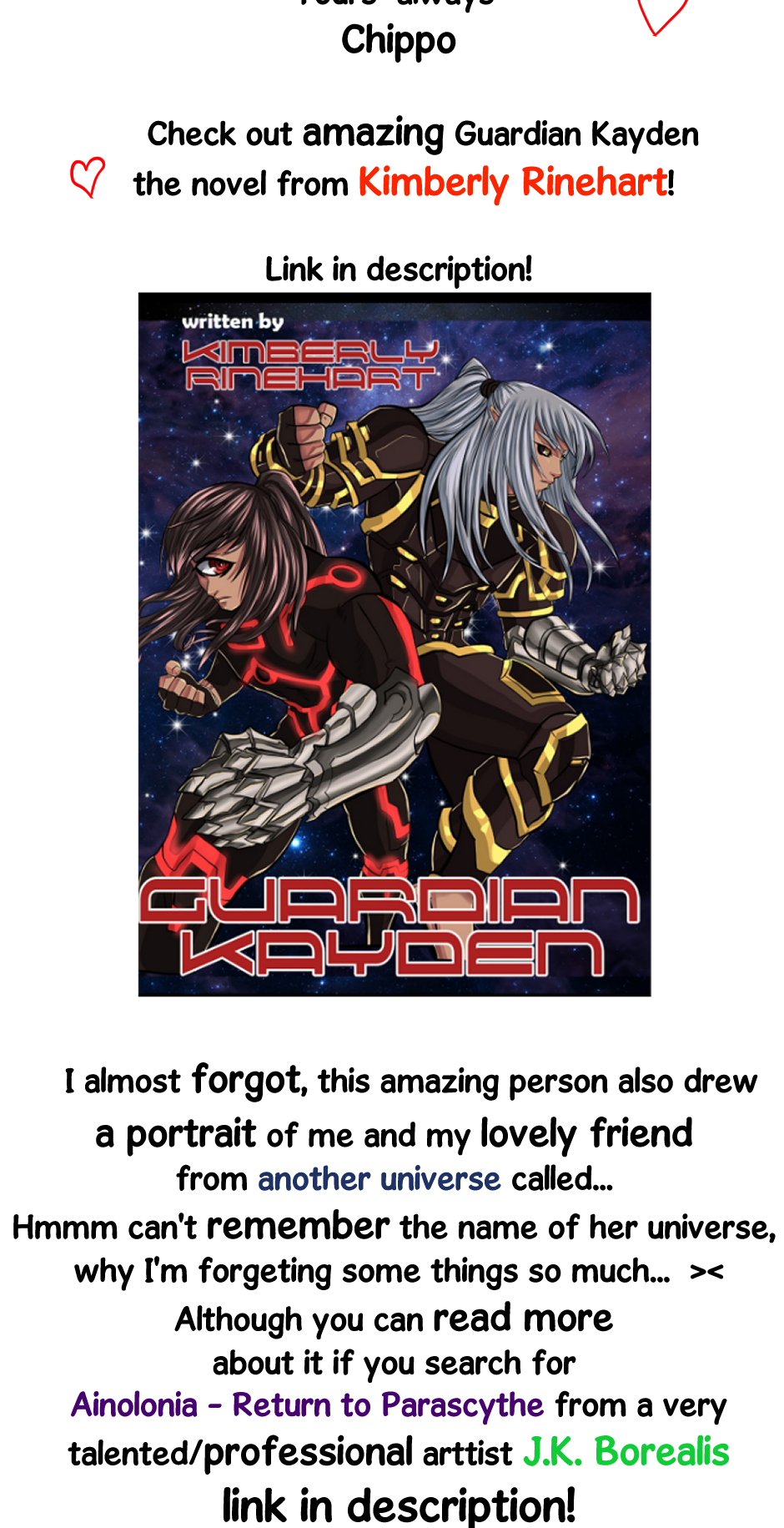 Kimberly Rinehart - https://tapas.io/series/Guardian-Kayden/info J.K. Borealis - https://tapas.io/series/AinoloniA---Return-to-Parascythe/info