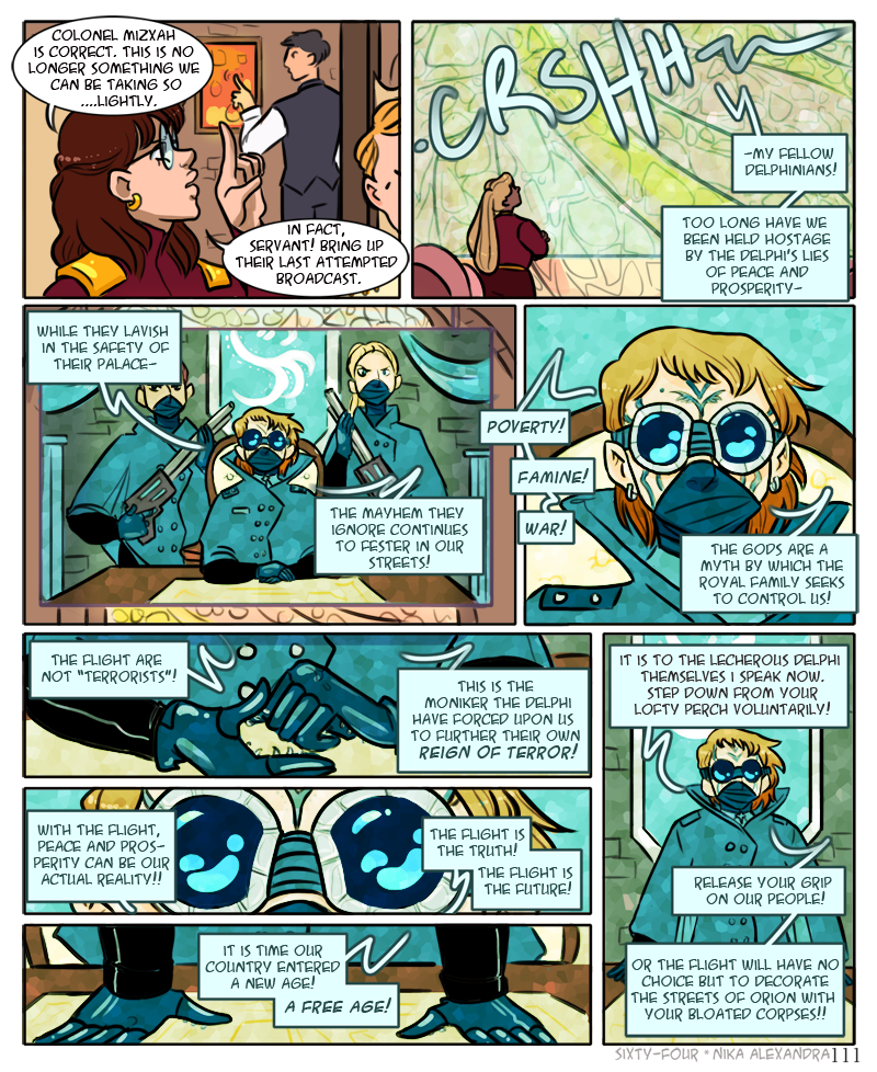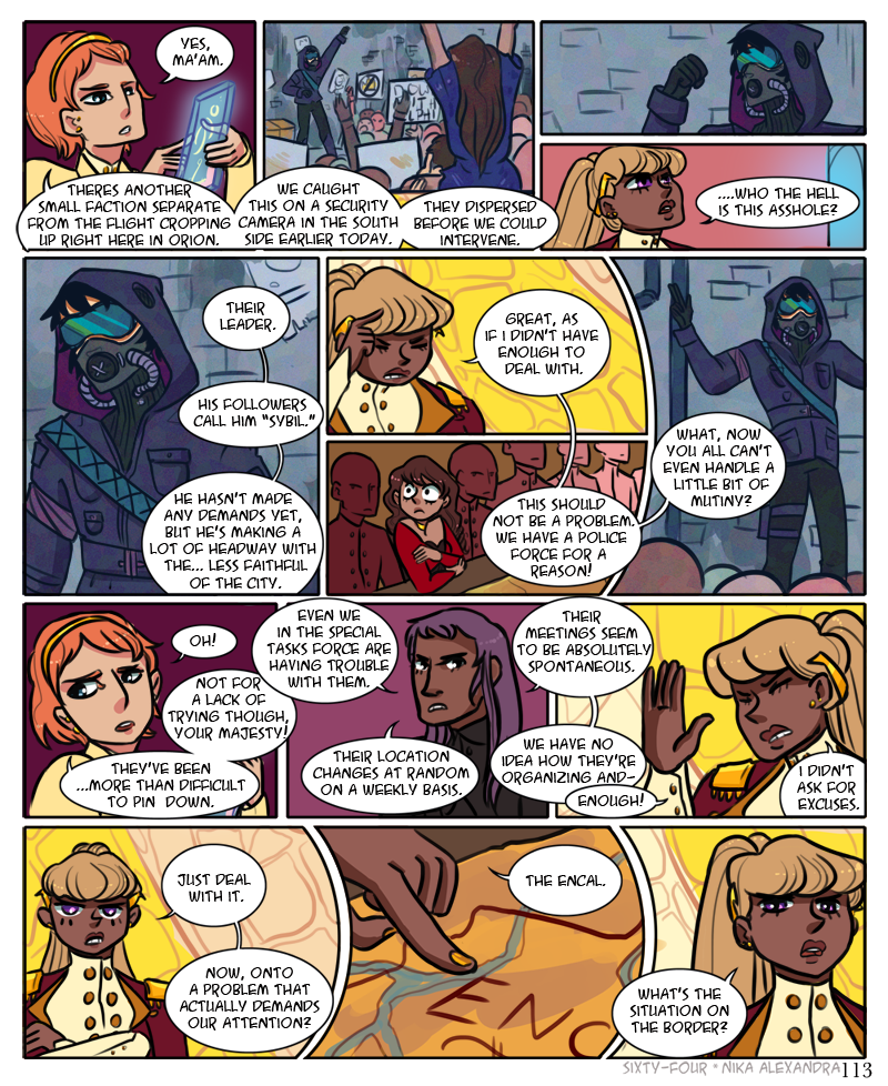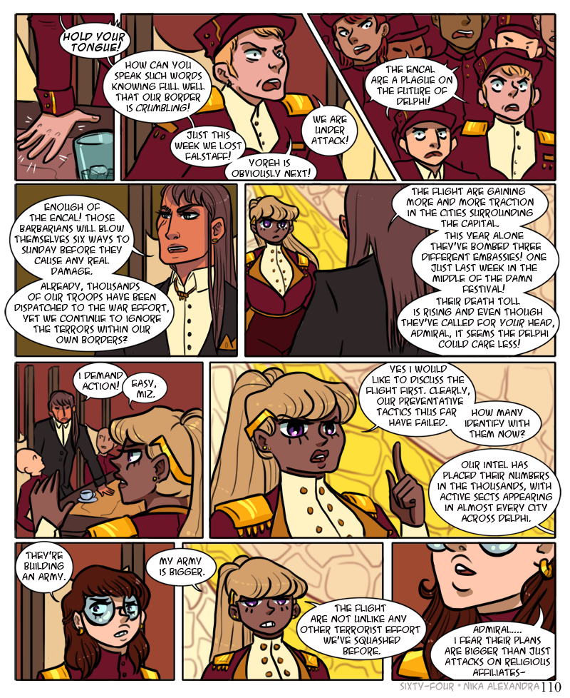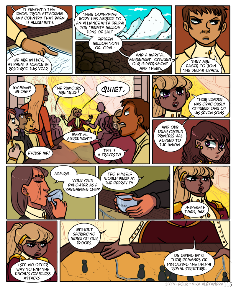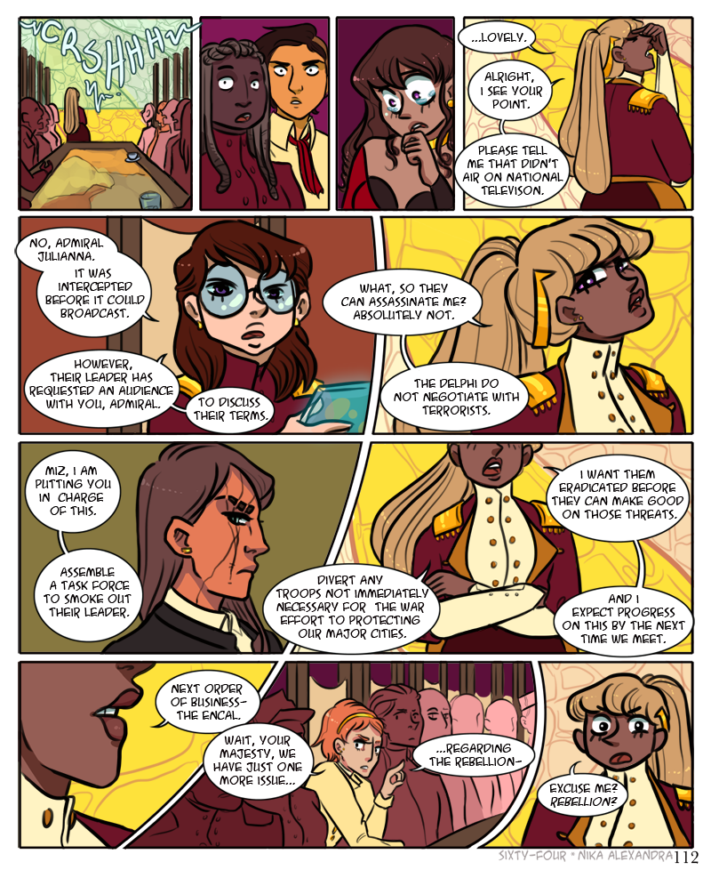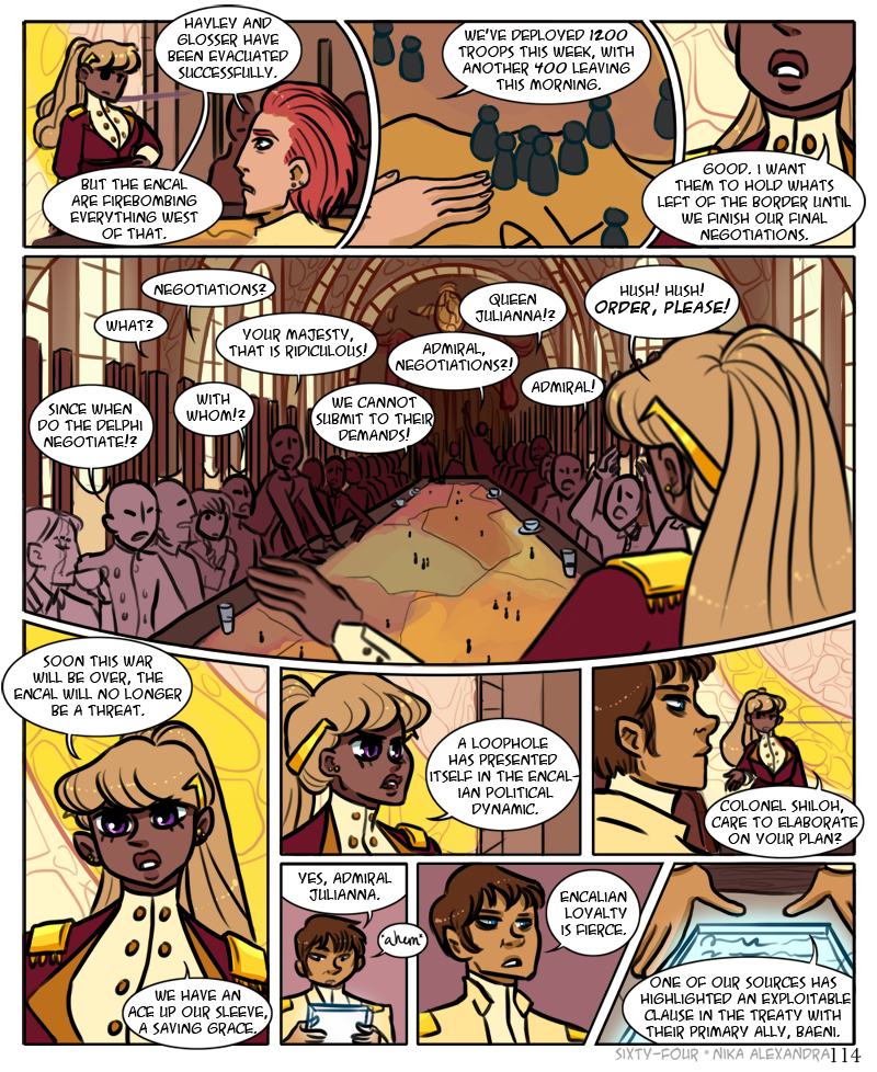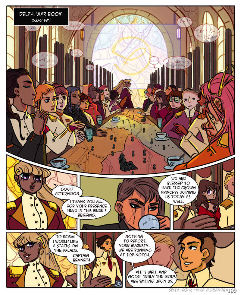 ah, another large detailed panel, for the third page in a row, because i do in fact hate myself and enjoy torture ;_; anyway! welcome to the war room, populated with all julianna’s top advisors in every field across delphi, ranging from various levels within her own military complex to officials of the delphi police to the highest ranking members of the delphi church. all come together once a month to discuss the country’s security affairs. lately though, with the encalian threats on the border and the flight causing havoc in the mainland, they have begun meeting more often, much to the chagrin of the advisors who must travel to orion from elsewhere in the delphi territory