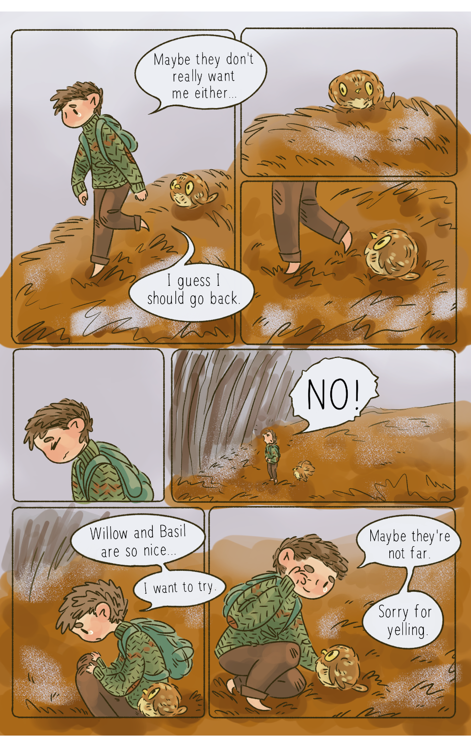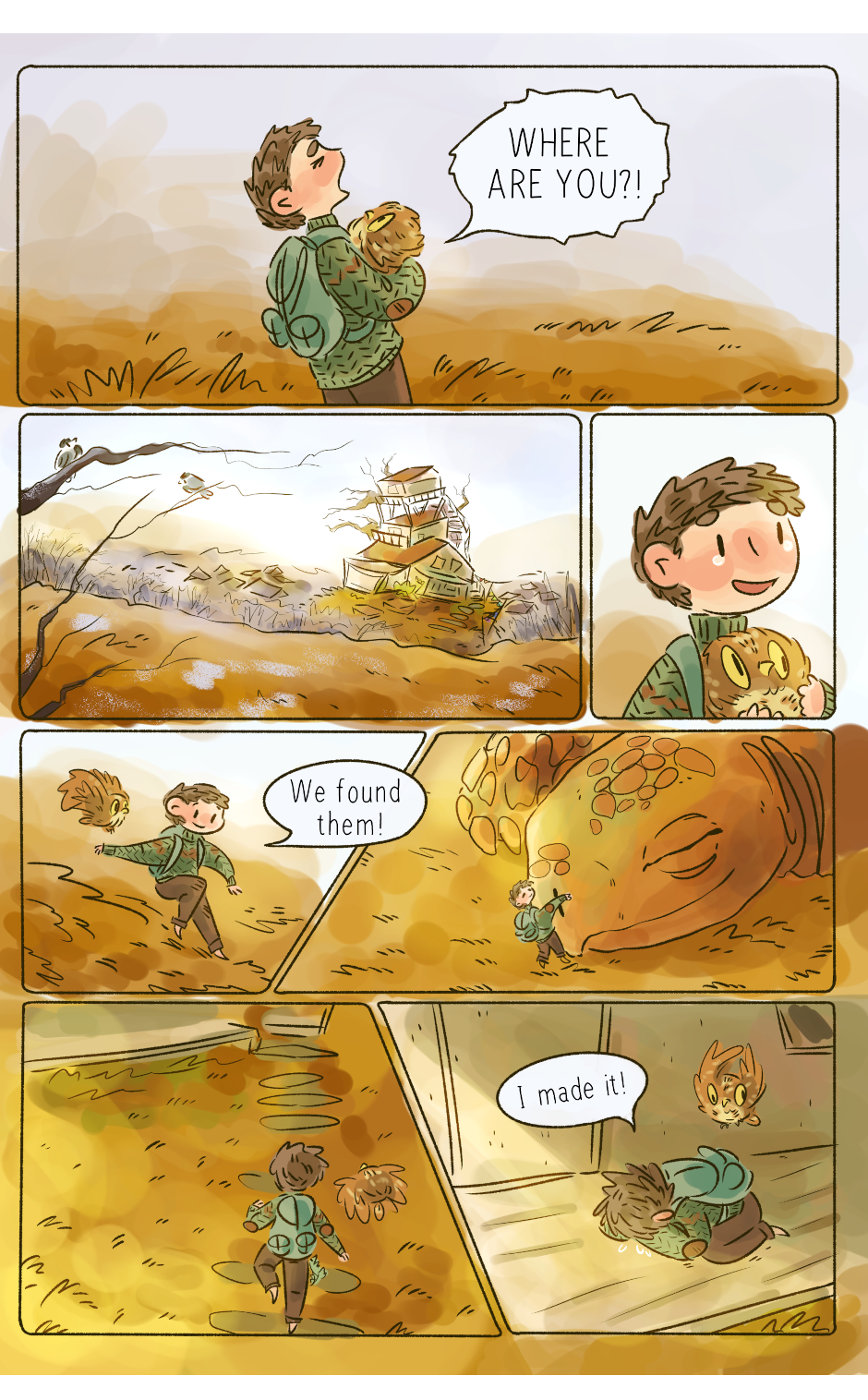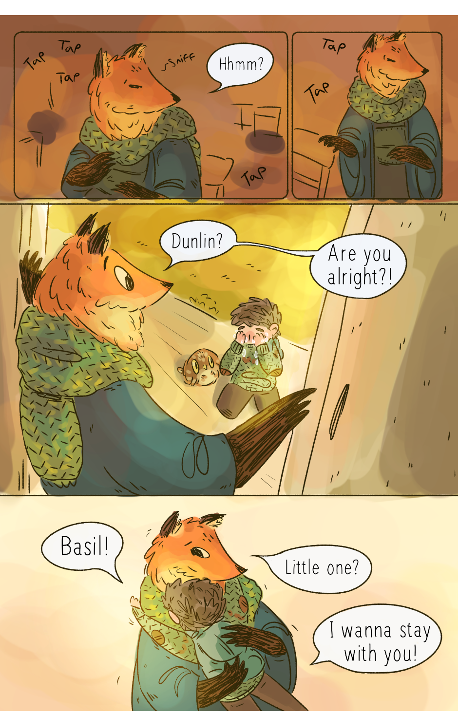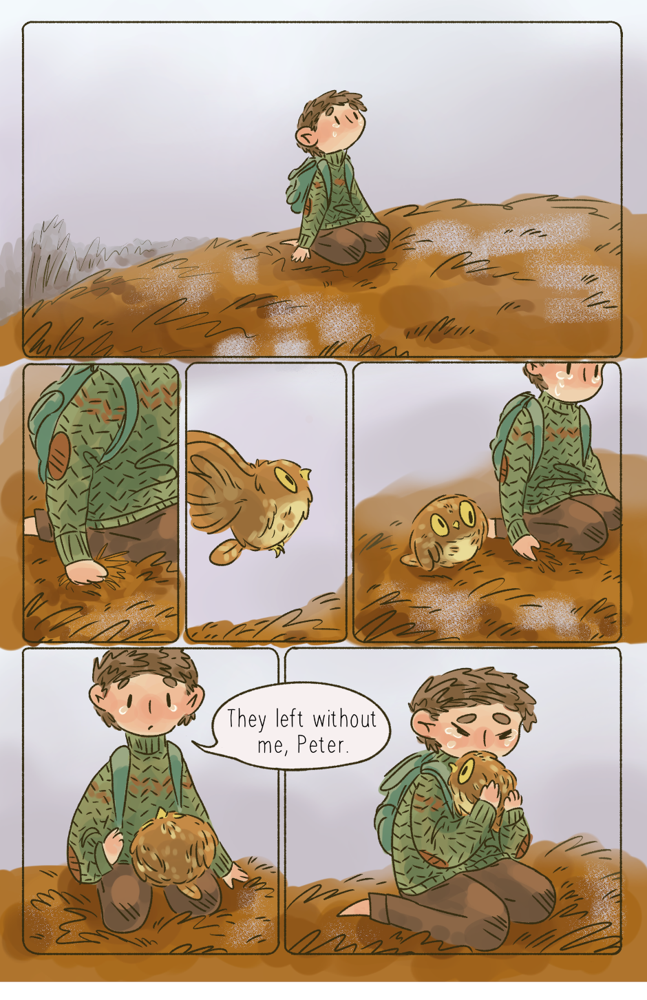Through a magical doorway in a nearby forest a small, aching family find each other and embark on a cozy journey of personal healing and doing their best to help and care for the world around them on their travels. (This comic was created over the course of 2.5 years starting in 2019. I'm reuploading here to share with more people! Follow the rest of my work @jarofpencils on Instagram, and @rumpledcrow on Tumblr)