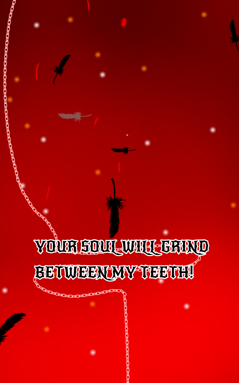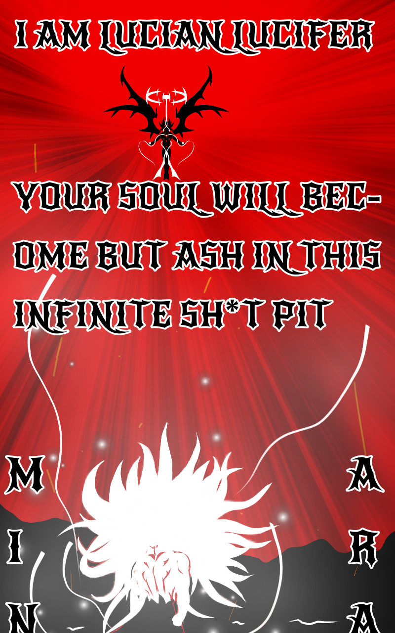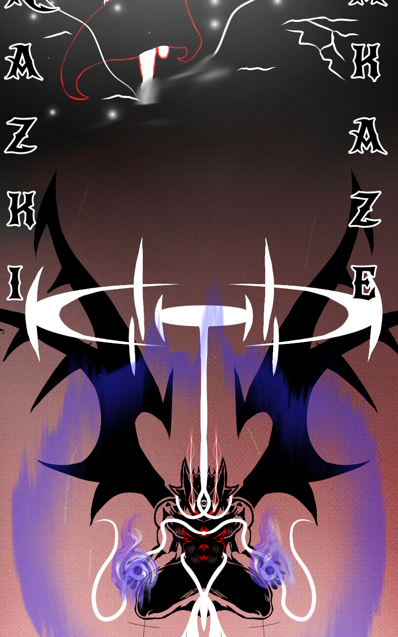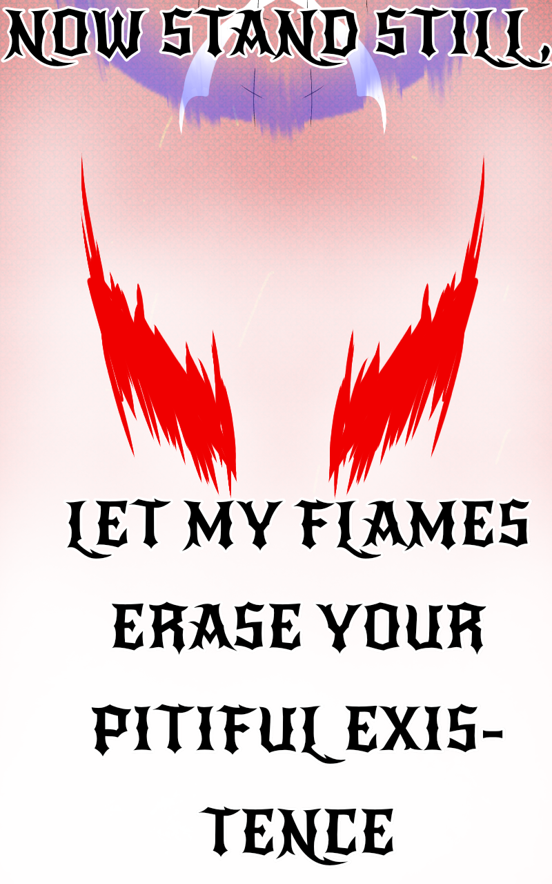 The main character stands his ground against the arrogant nephew of the late devil, with his entire body erased by the the burning flames of hell, his soul battles on against the enraged foe, while Hell itself collapses in the background of the fate deciding battle.