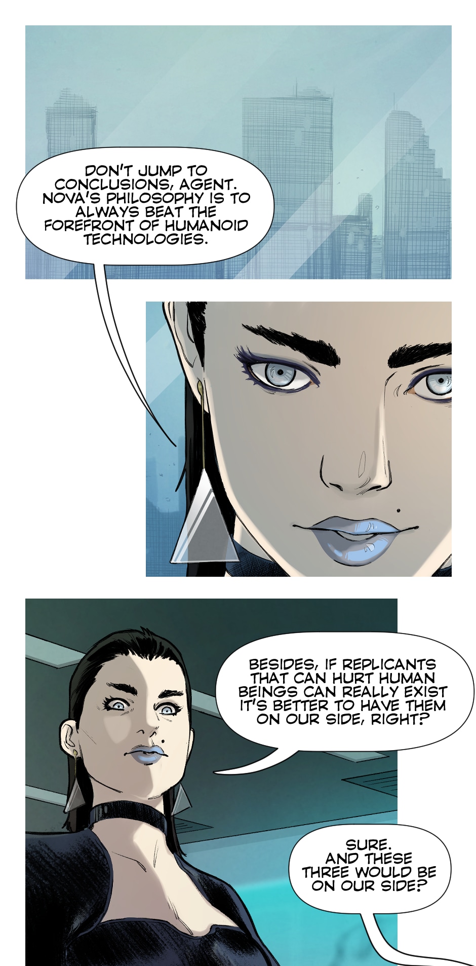 Replicants, or Reps, coexist in the society in order to improve human life. Some consider them an advanced life form. Some openly oppose them, like the Church of the True Man. Special agent Chris Walker understands right away that it will not be an easy case when NOVA hires him to track down the three specimens that escaped from the Corporation’s labs. Three evolved, upgraded and dangerous creatures that, while escaping, kidnapped their brilliant creator, Dr. Fisher, and his young daughter Sybilla.