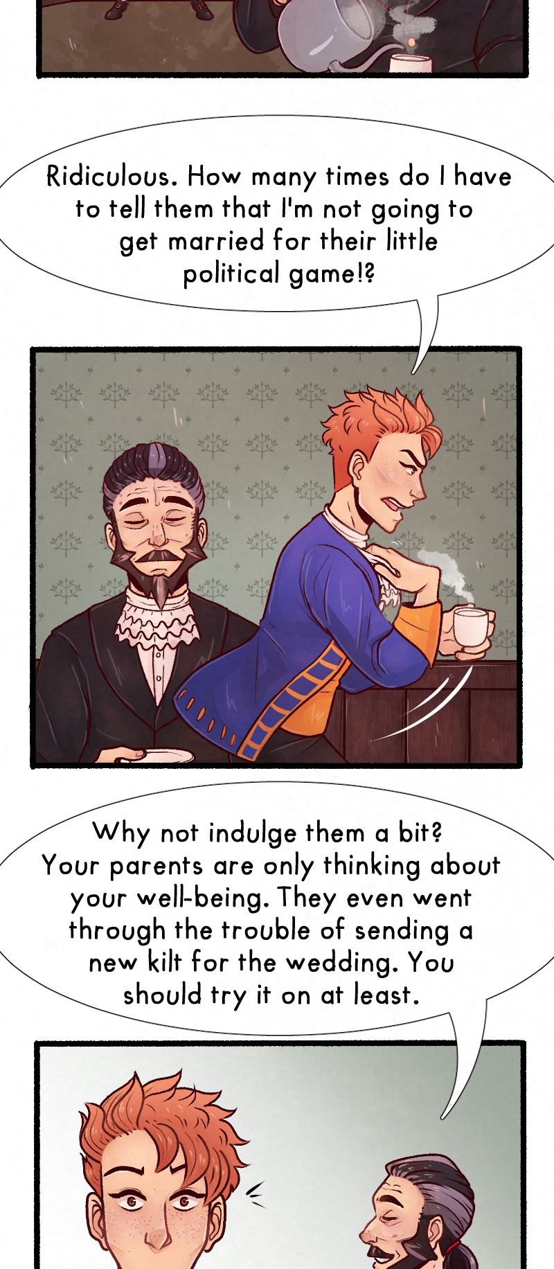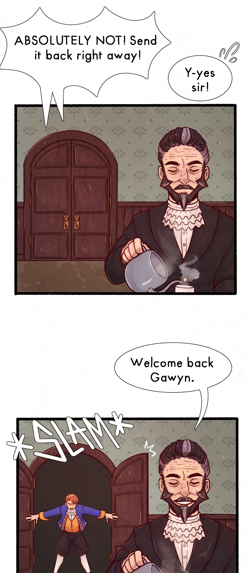 Welcome to the first MoonBites strip! I announced on my profile on Webtoon a few days ago that I needed more time on the next episode. MoonBites are going to be short flashback strips and only be uploaded if I need a little more time between the bigger strips, need a break, or to answer FAQs. In this strip you have human!Gawyn and his butler Bram. I hope you guys enjoy seeing the flashbacks when they come! G is in his early 20's here.