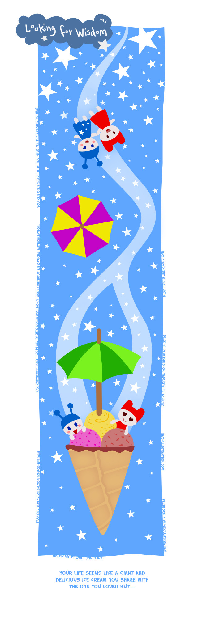 "Little one" is falling and looking for something to hold to... This is a metaphoric travel talking about different aspects of life with a cute and experimental style (using long vertical format and rarely dividing scenes inside each episode). It's not just a common web comic but some kind of graphic philosophical story... But it's not super serious neither since Nax is a little bit crazy! This is a very special trip you are starting with "Little One", I really hope you will enjoy it!!