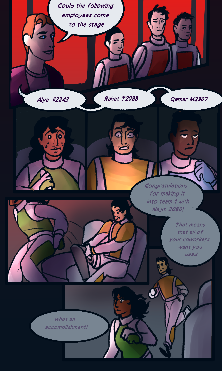 A dark scifi satire set in the corporate hellscape of the Tazdahir, featuring: Alya, soap opera addicted technician; Rahat, a nervous wreck pilot; Qamar, a disillusioned medic and Najm, a surprisingly kind murder machine. they are sent on a series of missions by their evil corporate overlord to stop union uprisings, retrieve goods and destroy rival companies. but along the way they find things don't add up and that something is being hidden from them. something very important.