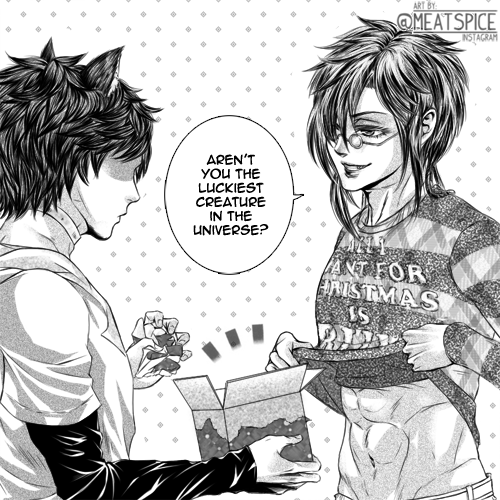 I am @yuriques' (IG) @NashitoArts (IG) Secret Santa! Here is her Yuya with my Rum. At first I thought since Rum and Yuya are both canines, they could get along, but-- *sigh* Rum. It might be a farfetched idea. // BTW, Rum is not a perv. He's just more of an accidental perv, a naive one. ALSO, he just wants attention so please notice him more. LOL