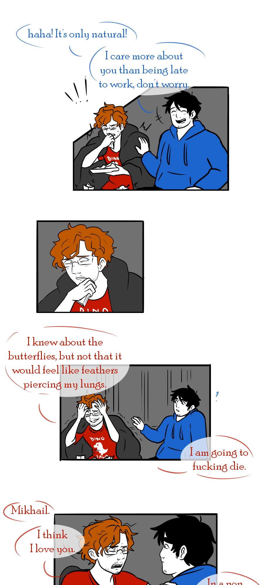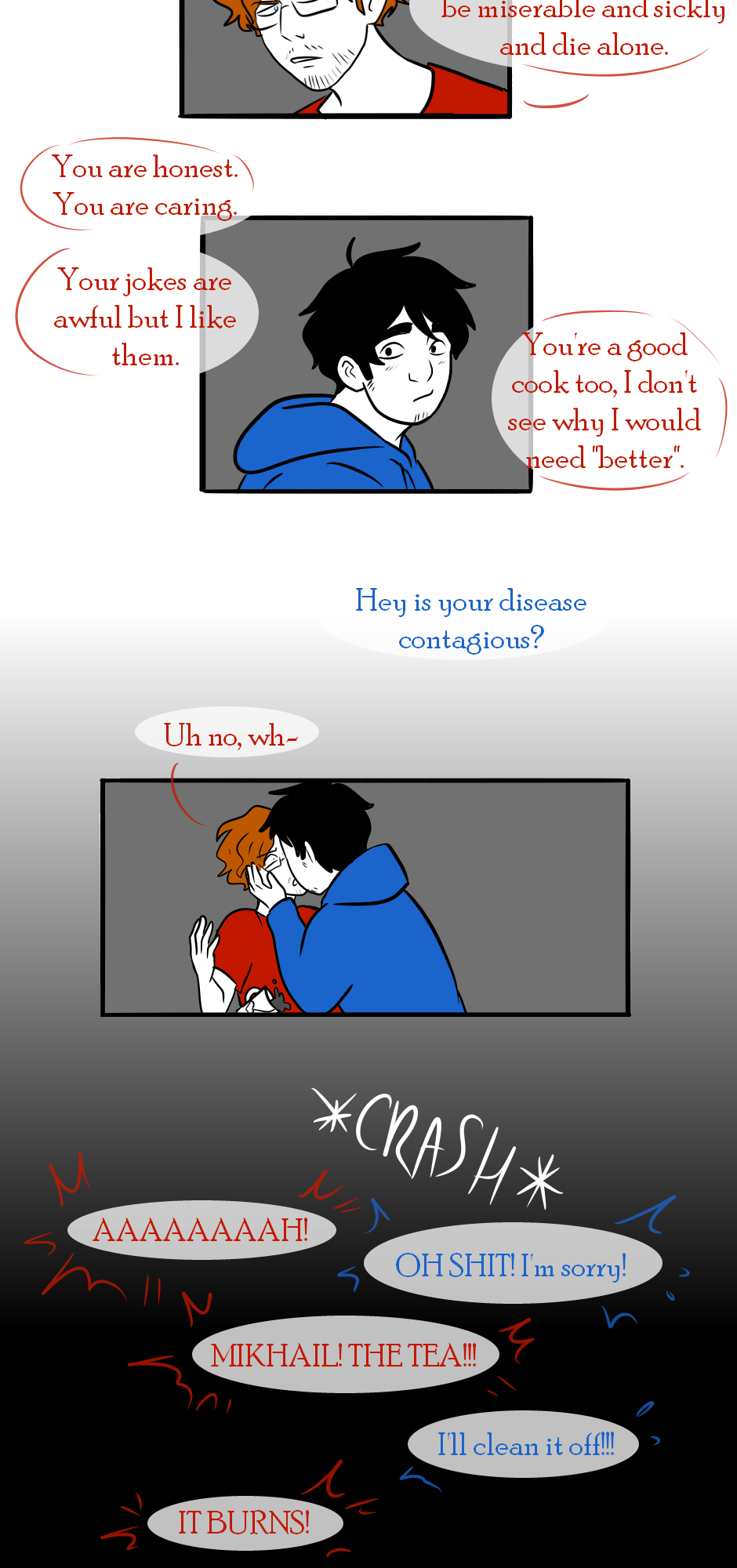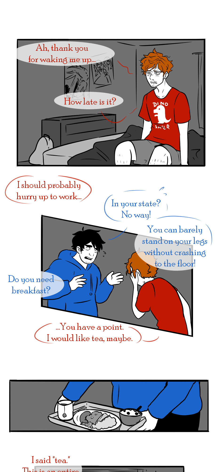 In which Mikhail realises Stefan is not up yet and decides to arrive at work later than usual in order to care for his roommate...