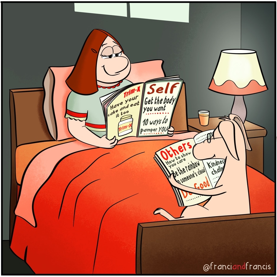 About a year ago, I went to a kill shelter to rescue a dog and found my pig, Francis. We’ve been together ever since. He gets me through my fat days and tells me I look beautiful as I am… I tell him to zip it.
