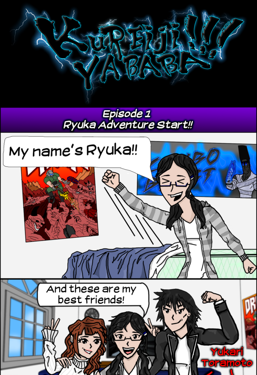 Kureiji Yababa!!! follows the bizarre adventures of the many people who call the coastal town, Kururicho, home. KuYa's main characters include teen rebel Ryuka Ryujima and her cohorts; Sally Jonesmith, who has to put up with her unusual sister Wendy; the sparking lovers, Sayuri and Rin; and many more.
