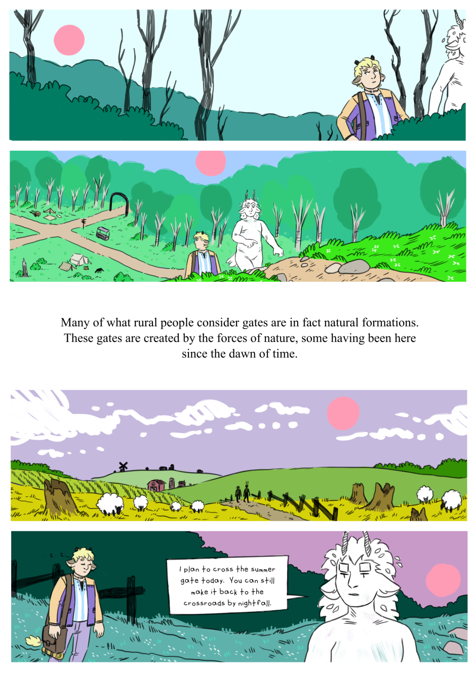 The only thing anyone knows about Elm is that he’s certainly not human. In an opportunity to prove himself to the village elders and learn more about who (or what) he is, Elm agrees to take a request to the fabled Earth Gate, for the Earth Goddess to fulfill. Except Elm has no idea where the Earth Gate is and (despite his protests) he’s got an eager young demigod tagging along. [Updates Thursdays]